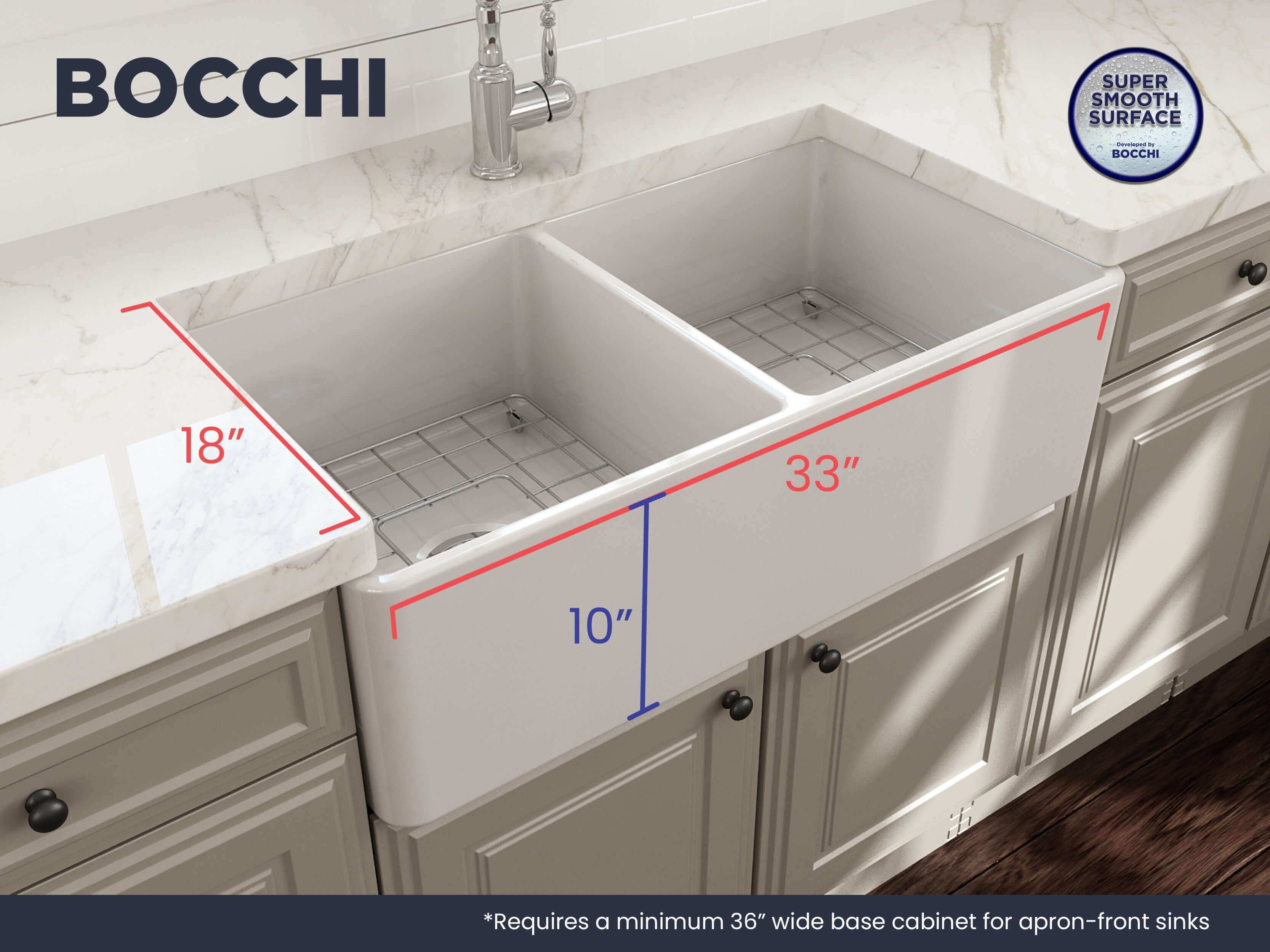 - Requires a minimum 36 in. wide base cabinet for apron-front sinks
