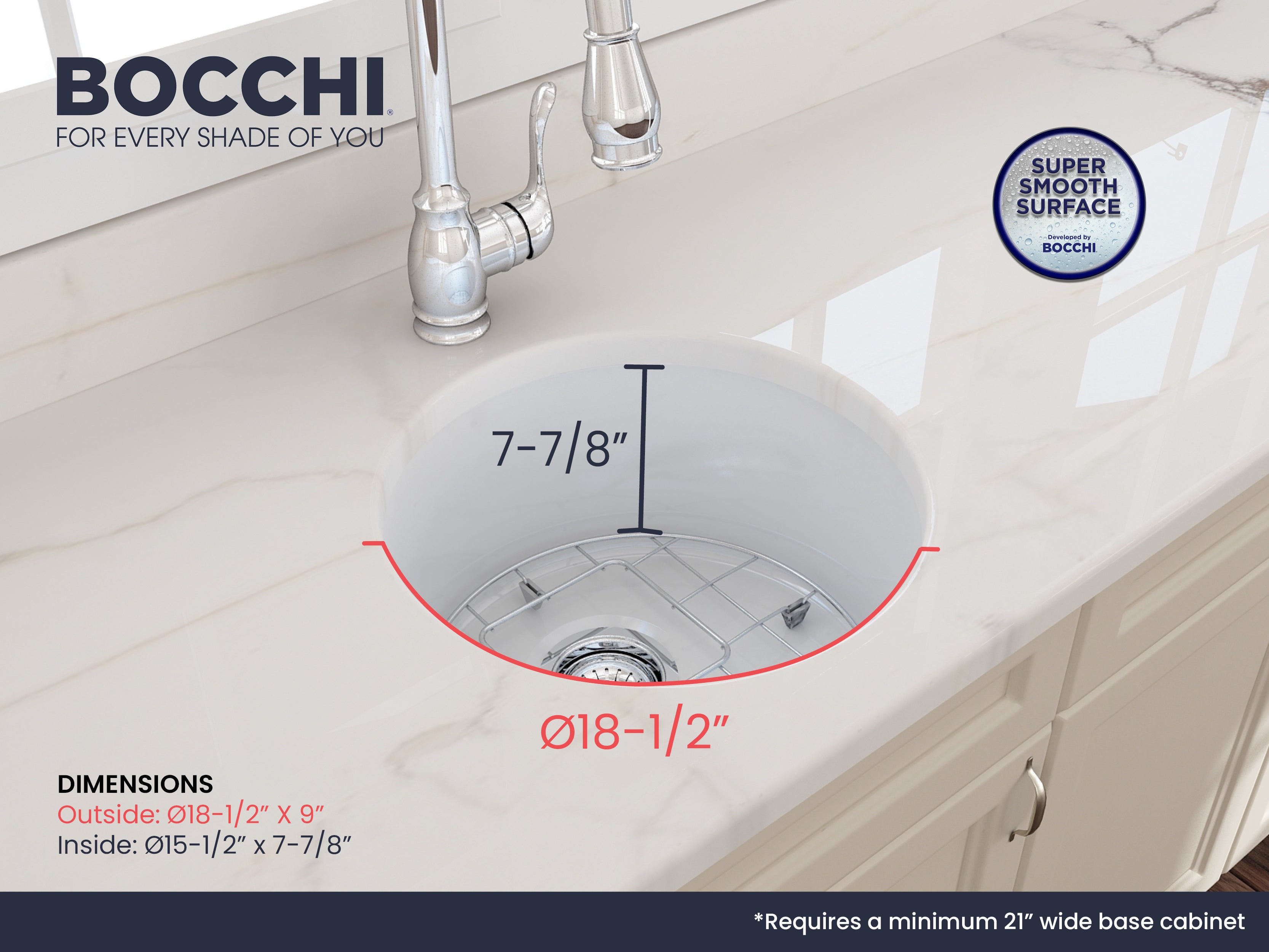 BOCCHI Sotto 18.5" Round Fireclay Undermount Single Bowl Bar Sink with Protective Bottom Grid and Strainer, White, 1361-001-0120