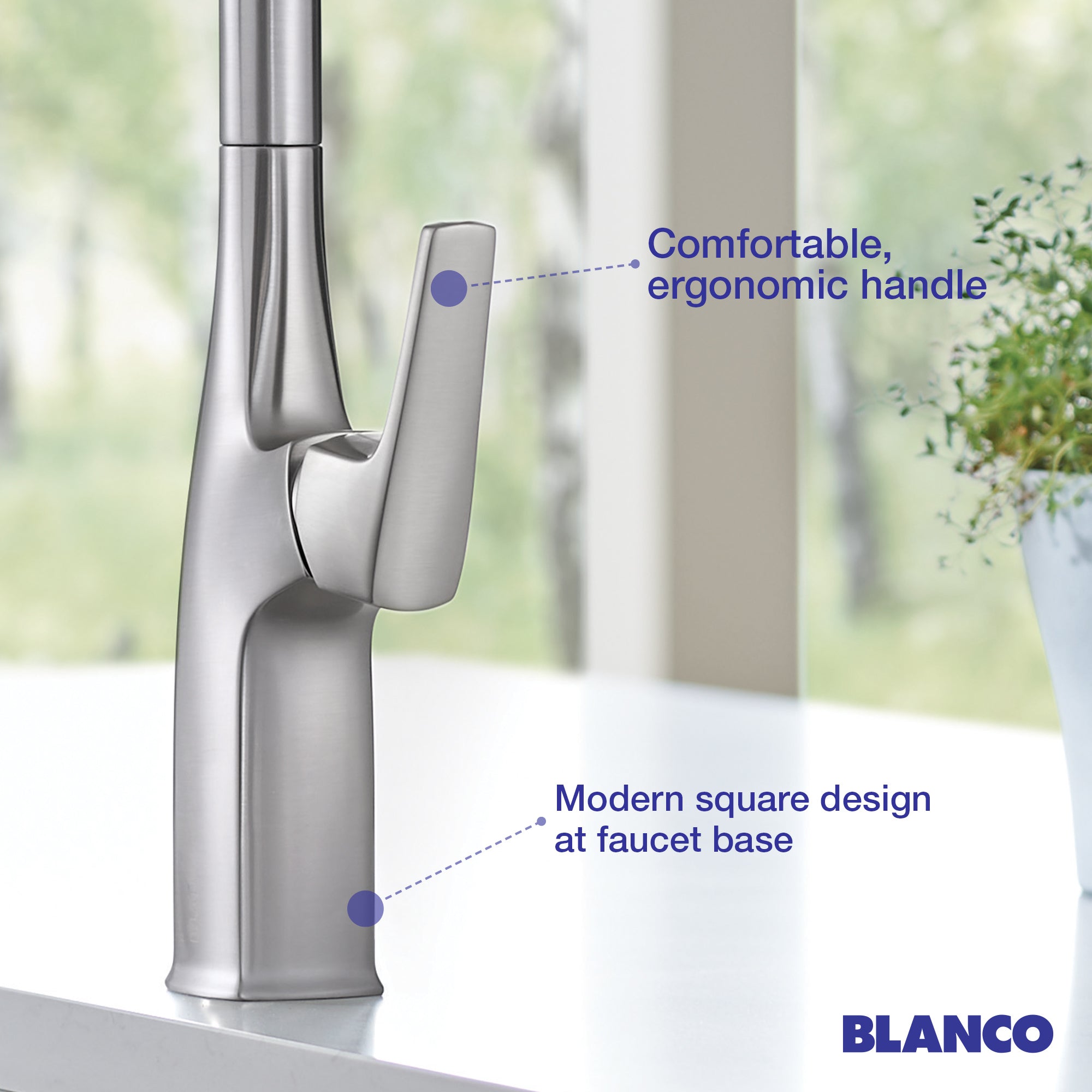 Where form and function unite. Inspired by faucets used in professional kitchens, BLANCO is the originator of the closed coil design and combines industrial style with modern appeal. The BLANCO RIVANA SEMI-PROFESSIONAL KITCHEN FAUCET delivers powerful performance with sleek design aesthetics. A clean, square design at the faucet base transitions into a rounded spout, blending organic shapes with ergonomic function. The BLANCO RIVANA provides home chefs with the ultimate in luxury and performance.