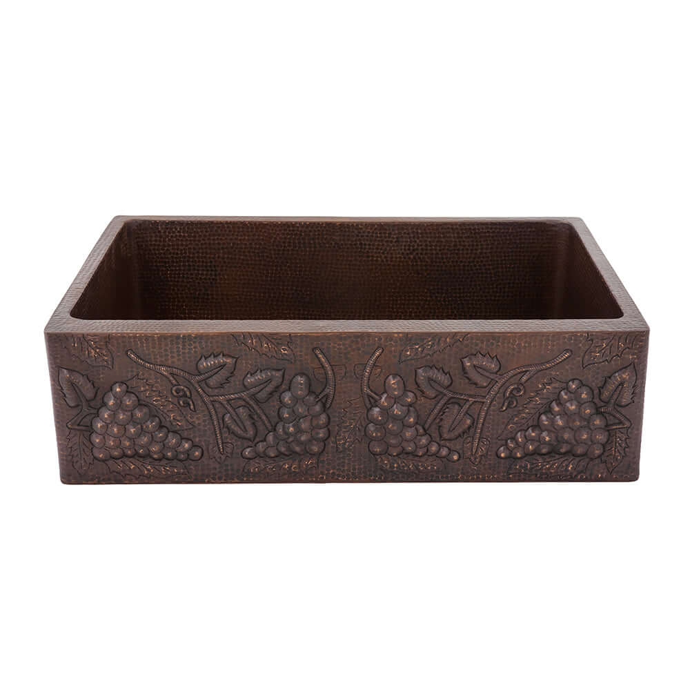Premier Copper Products 33" Hammered Copper Kitchen Apron Single Basin Farmhouse Sink w/ Vineyard Design with Matching Drain and Accessories, Oil Rubbed Bronze, KSP3_KASDB33229G