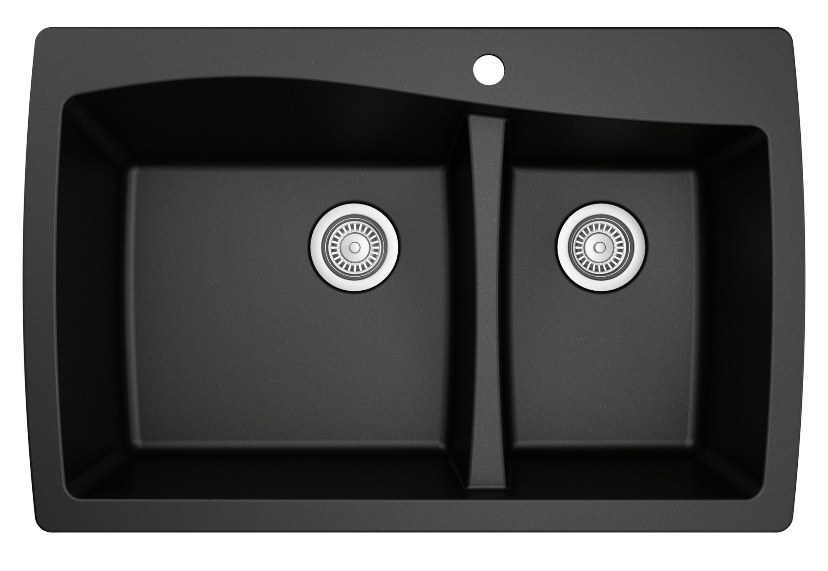 Karran 34" Drop In/Topmount Quartz Composite Kitchen Sink with Accessories, 60/40 Double Bowl, Black, QT-721-BL-PK1