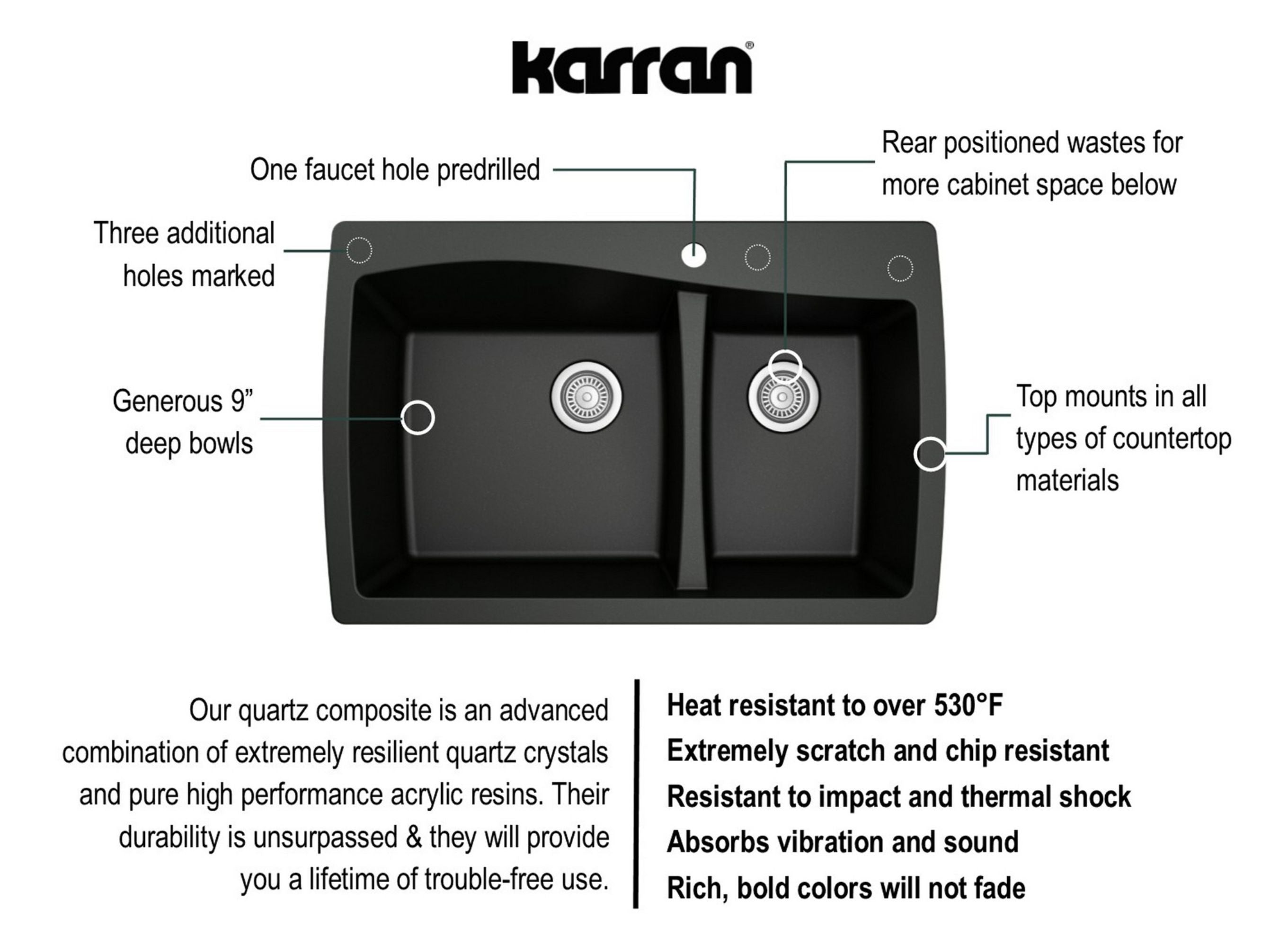 Karran USA is one of the leading manufacturers of sinks and faucets for the kitchen and bathroom. Karran manufactures sinks in a variety of durable materials including stainless steel, acrylic, quartz composite, and vitreous china. The company was founded in the late 1990s in Vincennes, Indiana, USA, and has been a symbol for quality and reliability ever since.
