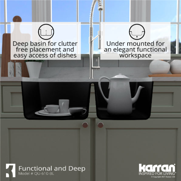 Karran 32" Undermount Quartz Composite Kitchen Sink, 60/40 Double Bowl, Black, QU-610-BL-PK1