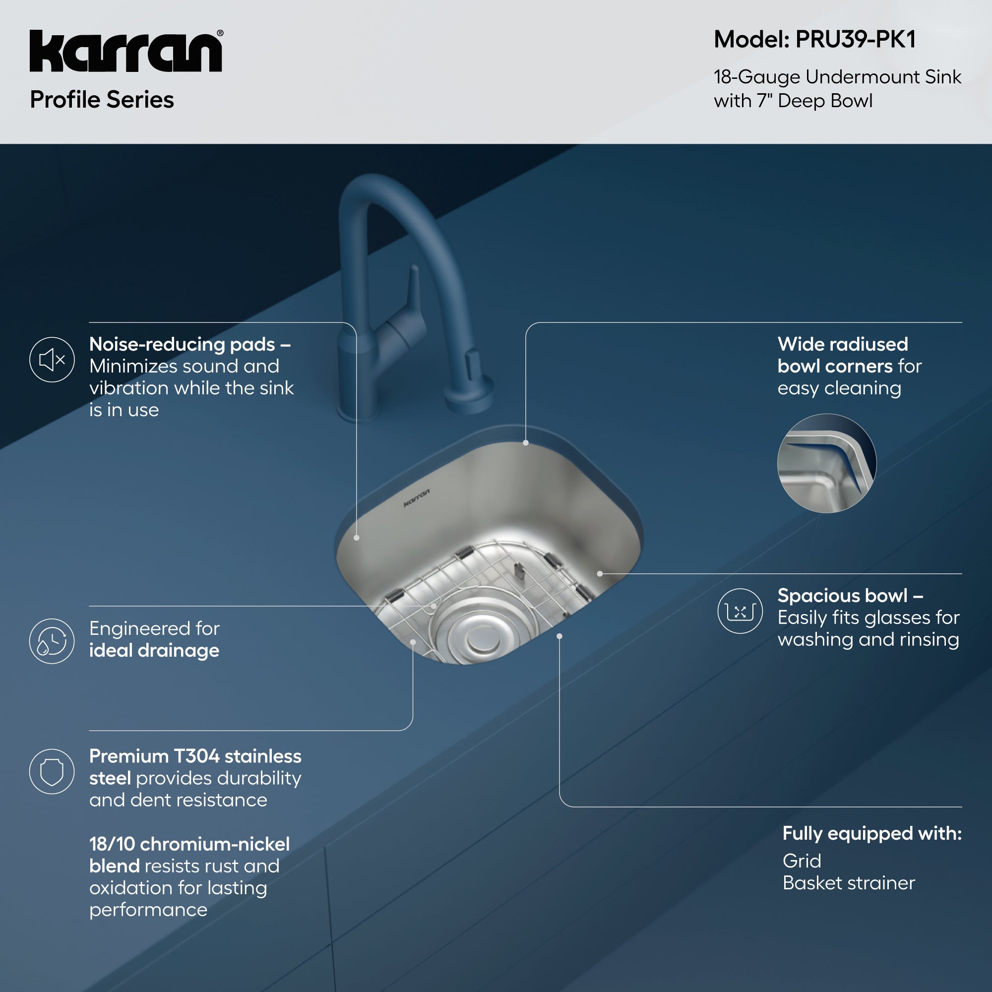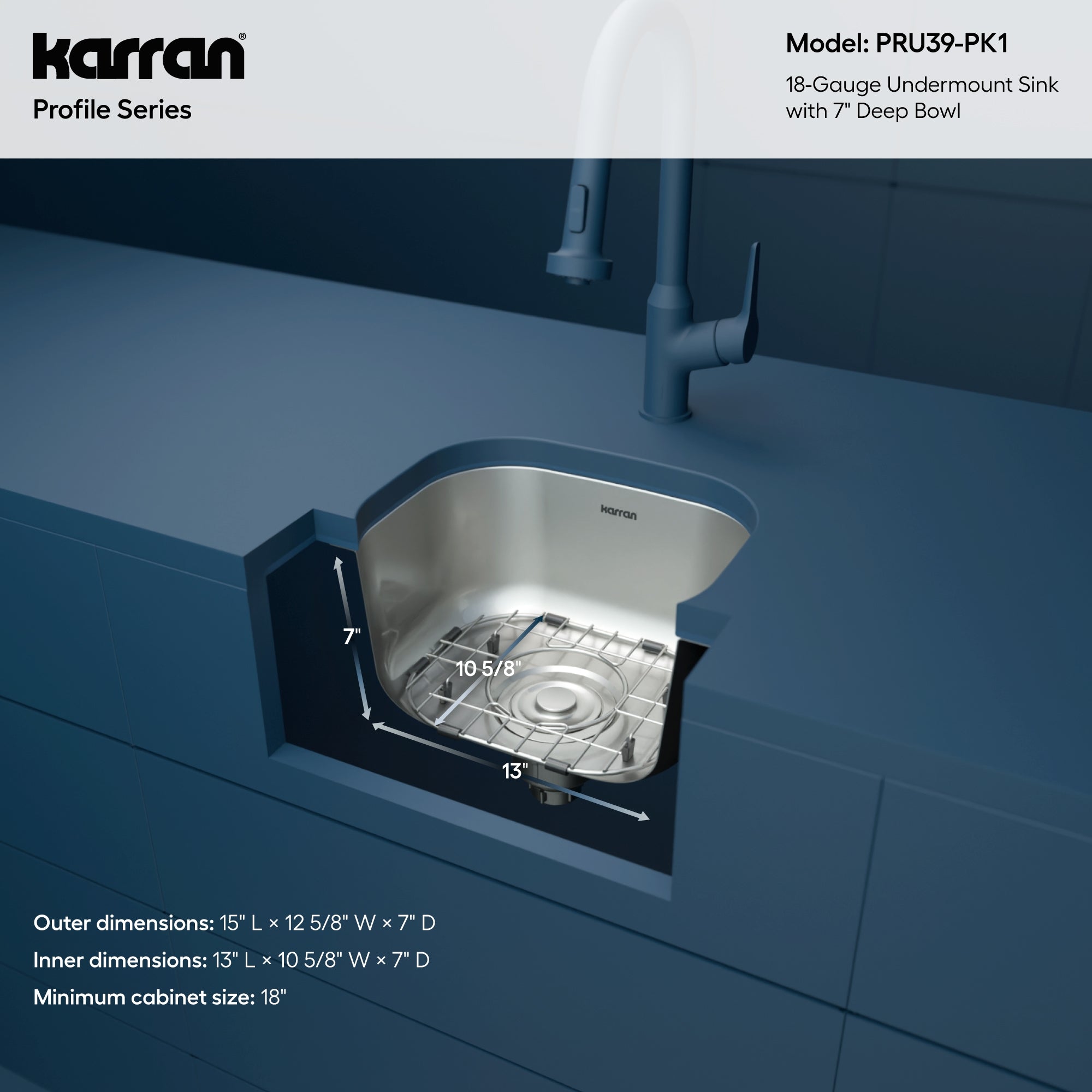 Karran Profile 15" Undermount Stainless Steel Kitchen Sink with Accessories, 18 Gauge, PRU39-PK1