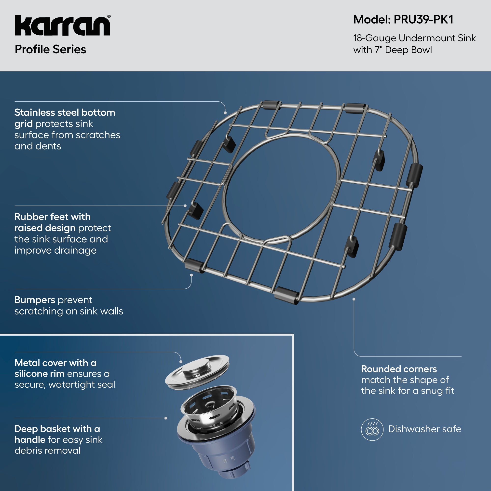 - Custom-fit dishwasher-safe bottom grid with rounded corners protects sink surface while promoting proper drainage and functionality