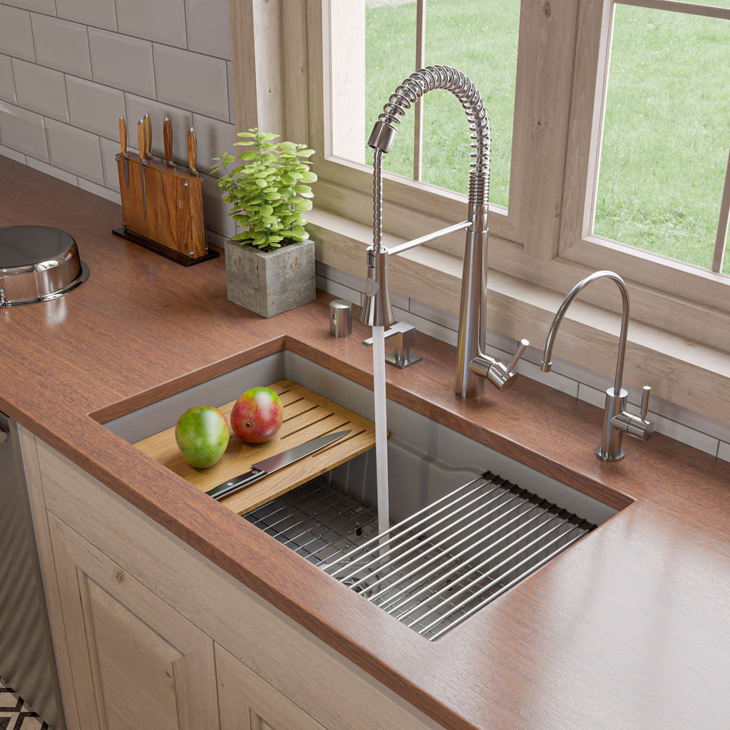 - This workstation sink includes three handy accessories: a stainless steel grid to protect the bottom, a custom bamboo cutting board that fits perfectly on either side of the step rim, and a convenient drying rack.