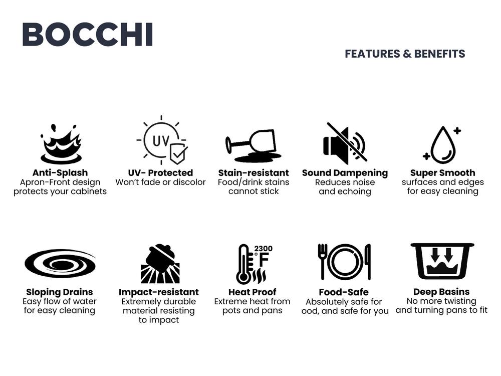 BOCCHI sinks bring back the ultimate material to your kitchen. Fireclay, a 100% natural, organic and recyclable material used by craftsman for centuries to create timeless appliances, has now returned to your kitchen. Fired in kilns at 2000F, Fireclay becomes the most durable material used in today's kitchens. Thus, dealing with extreme heat coming from pots and pans is definitely not a problem. Additionally, our proprietary glaze is fused with the fireclay body so our sinks have a non-porous, uniform, scratch and stain resistant surface. With their protective bottom grid and distinctive looks, BOCCHI sinks are truly crafted to match your style and hold up to your busy life.