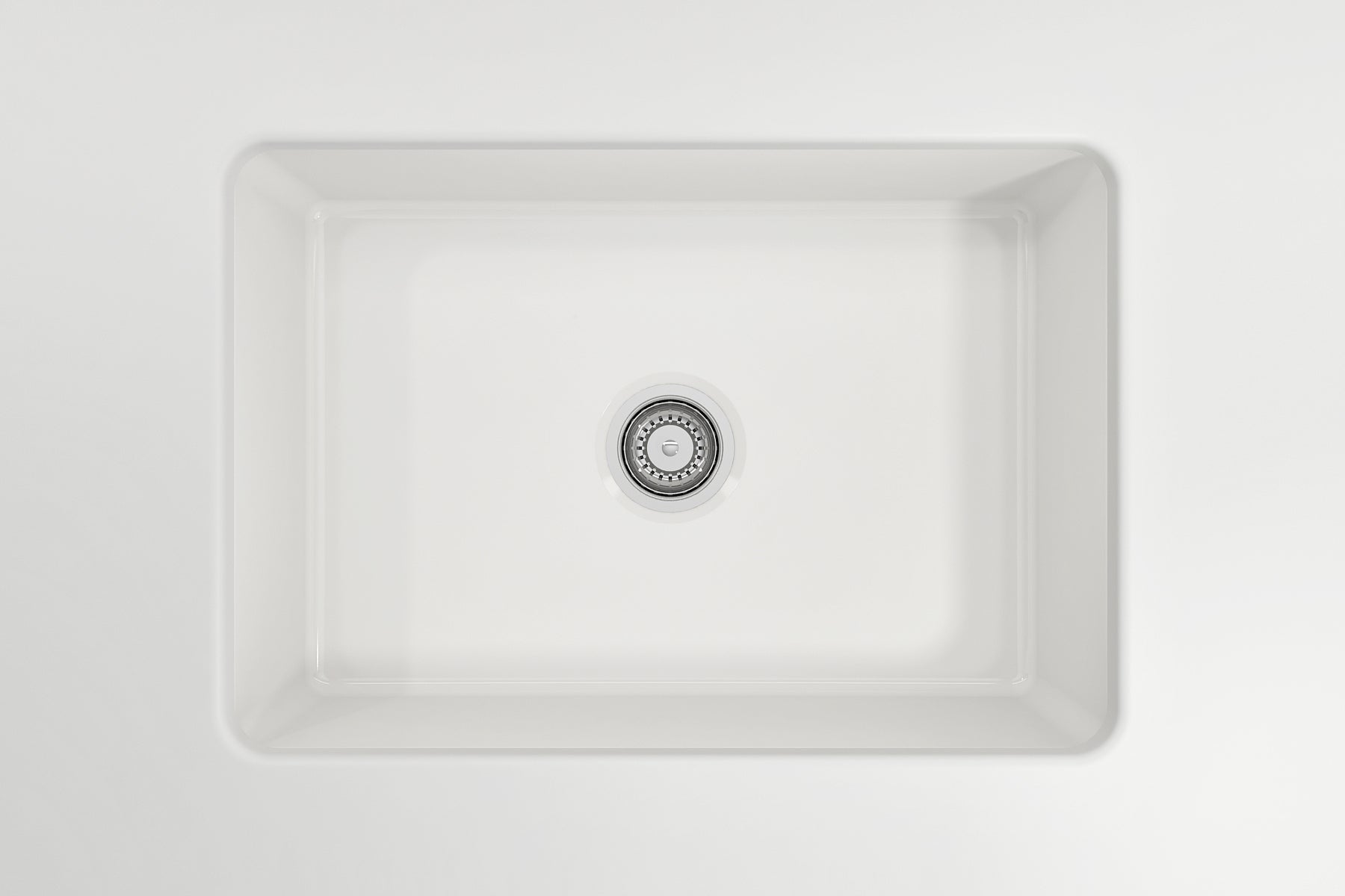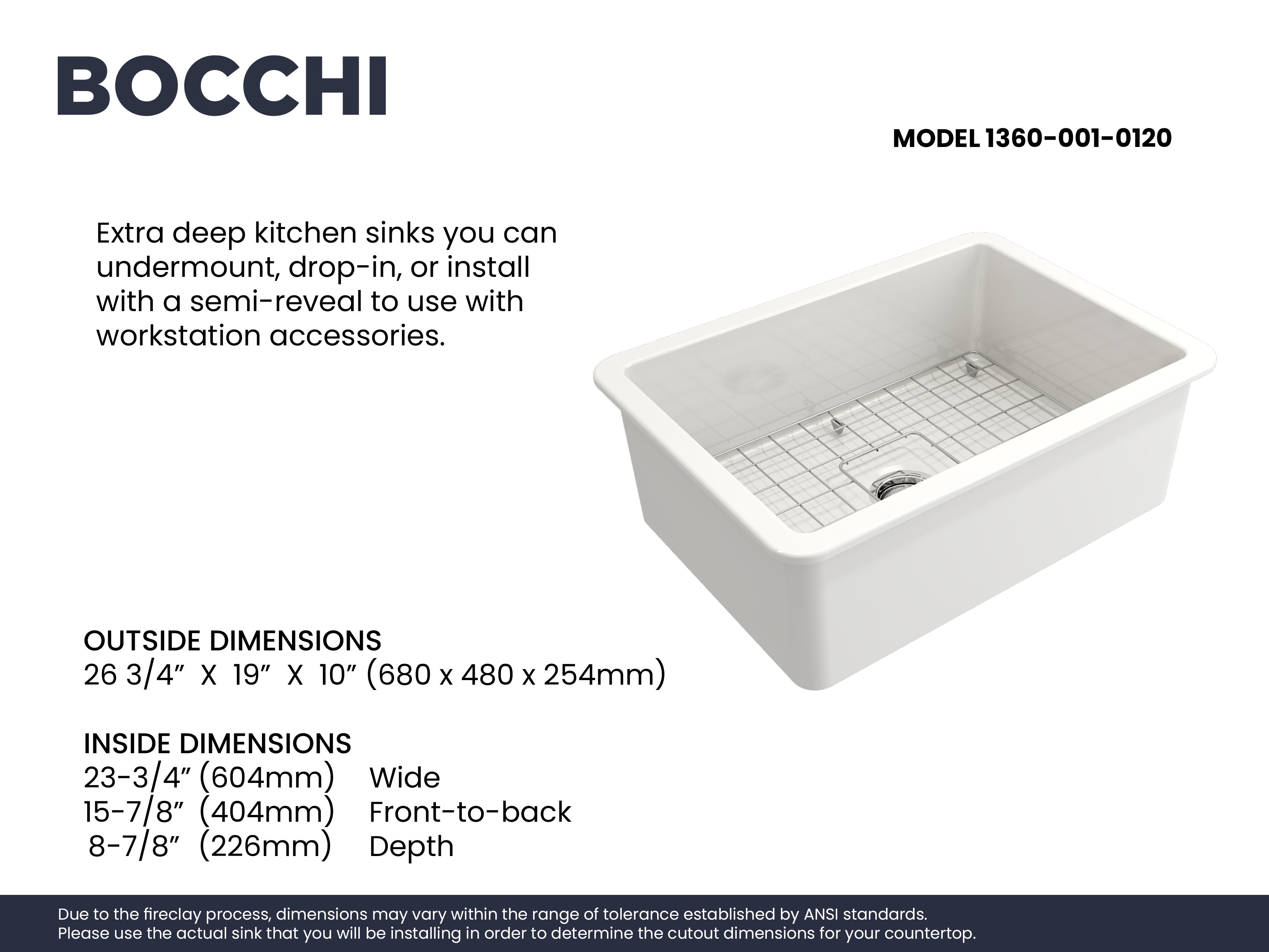 BOCCHI Sotto 27" White Fireclay Dual Mount Single Bowl Kitchen Sink Kit with Chrome Faucet and Accessories, 1360-001-2024CH