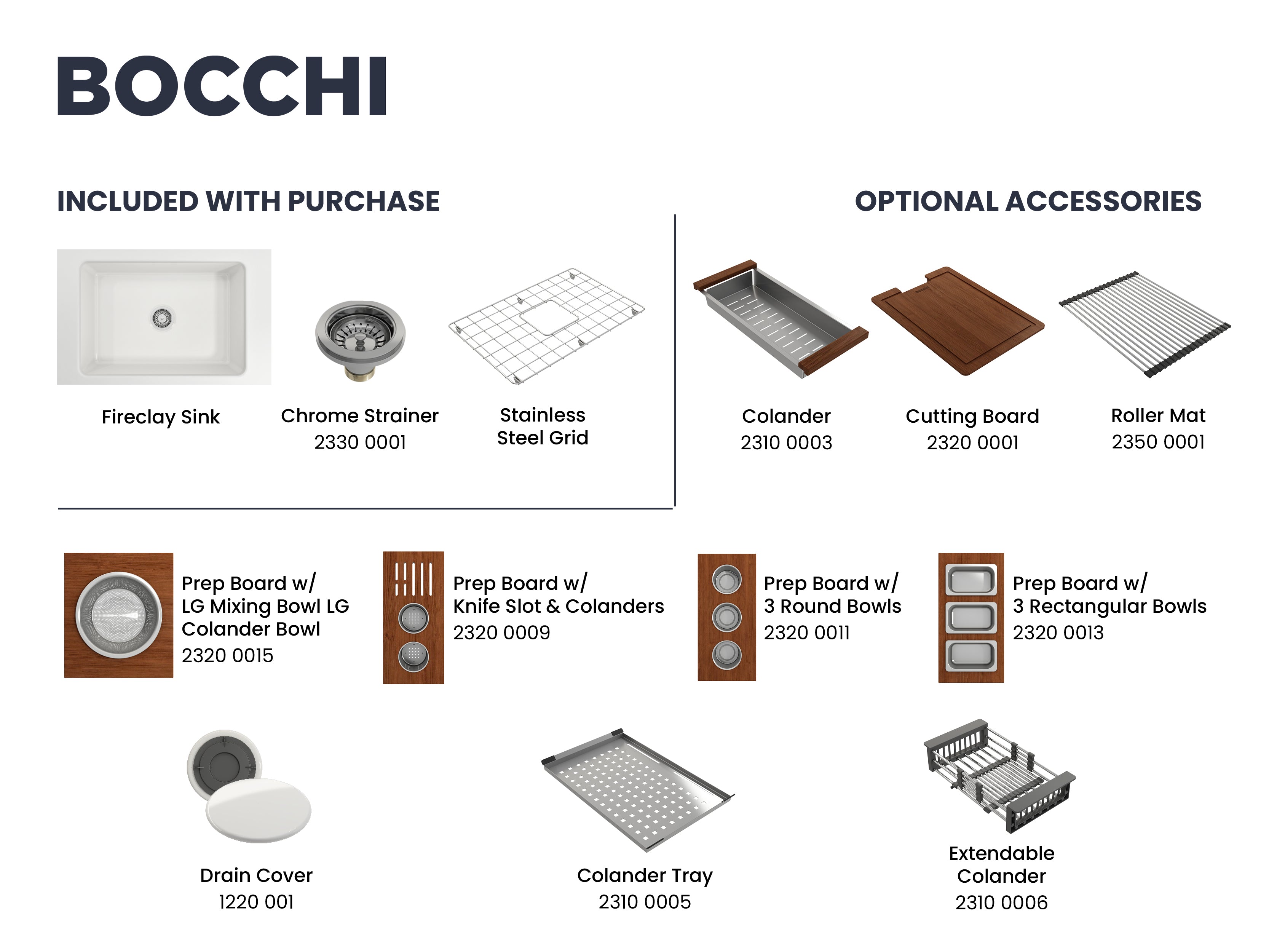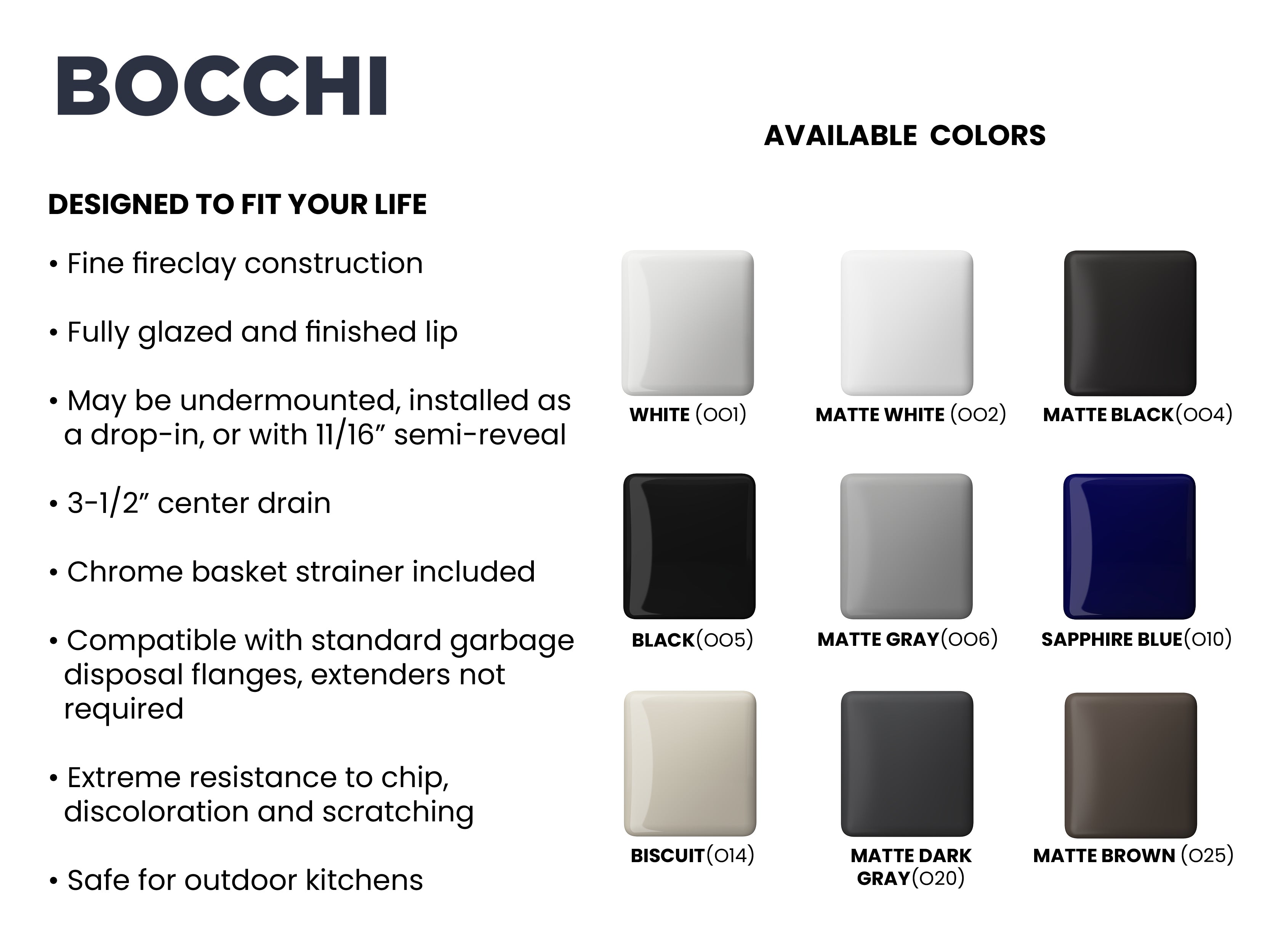 BOCCHI sinks bring back the ultimate material to your kitchen. Fireclay, a 100% natural, organic and recyclable material used by craftsman for centuries to create timeless appliances, has now returned to your kitchen. Fired in kilns at 2000F, Fireclay becomes the most durable material used in today's kitchens. Thus, dealing with extreme heat coming from pots and pans is definitely not a problem. Additionally, our proprietary glaze is fused with the fireclay body so our sinks have a non-porous, uniform, scratch and stain resistant surface. With their protective bottom grid and distinctive looks, BOCCHI sinks are truly crafted to match your style and hold up to your busy life.