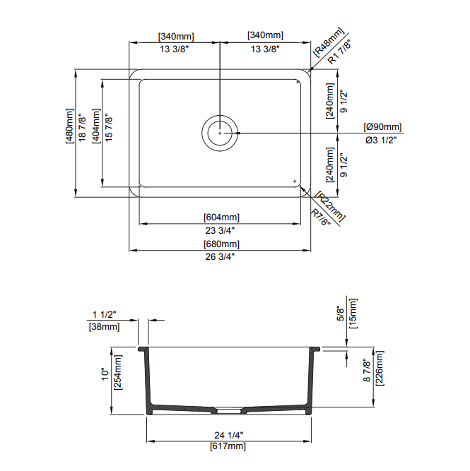 Due to the fireclay process, dimensions may vary. Please use the actual sink that you will be installing in order to determine the cutout dimensions for your countertop and cabinetry.