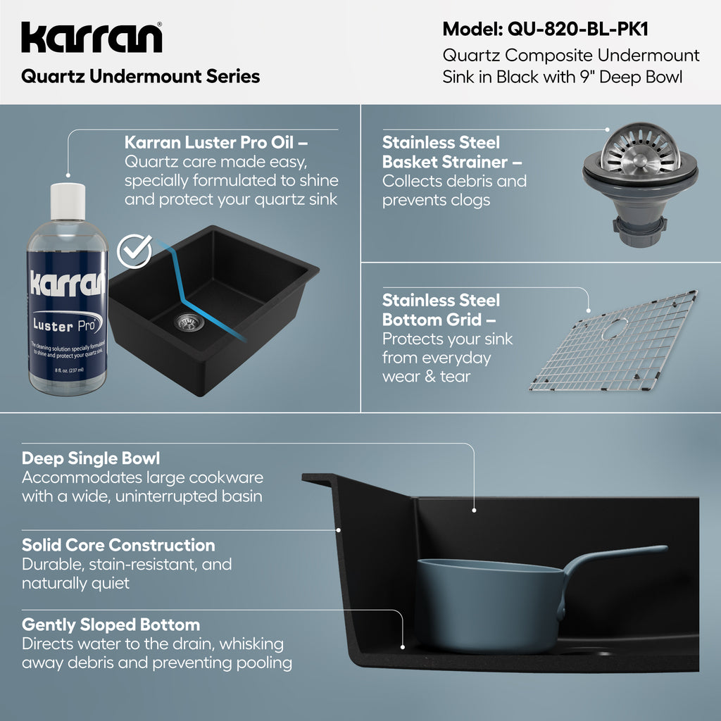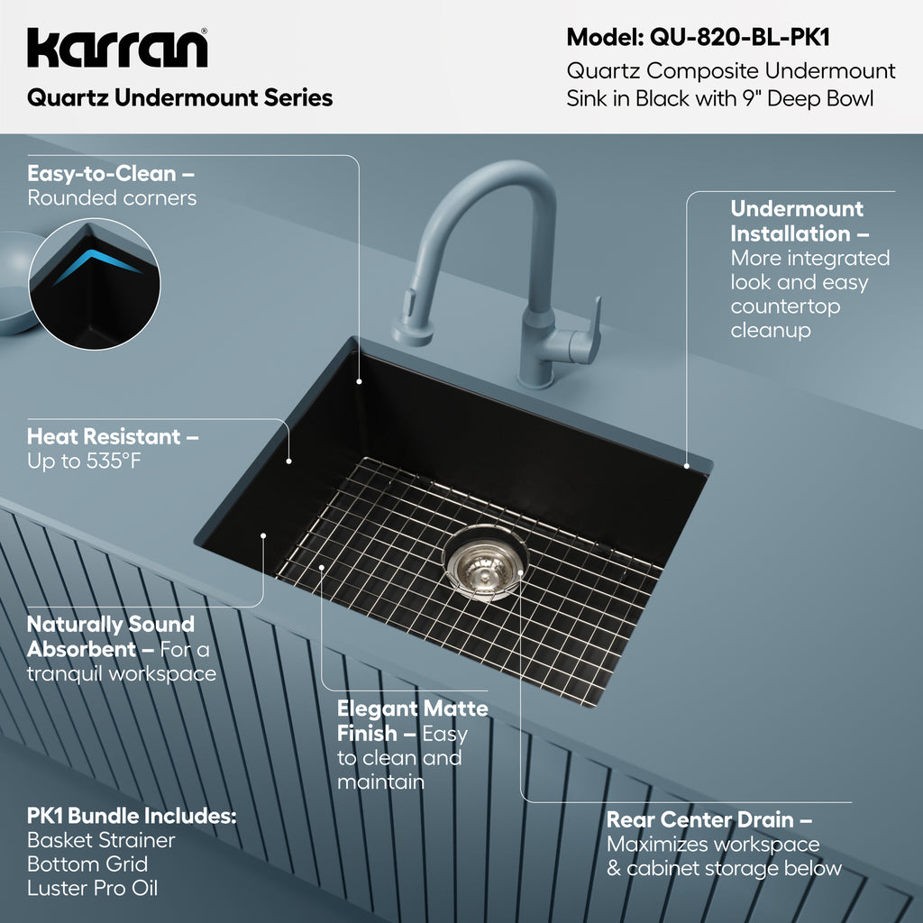 Karran 24" Undermount Quartz Composite Kitchen Sink with Accessories, Black, QU-820-BL-PK1