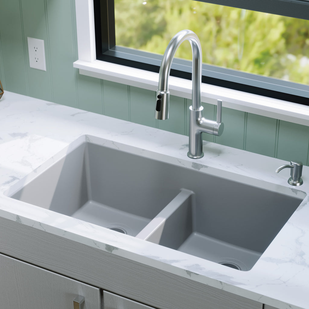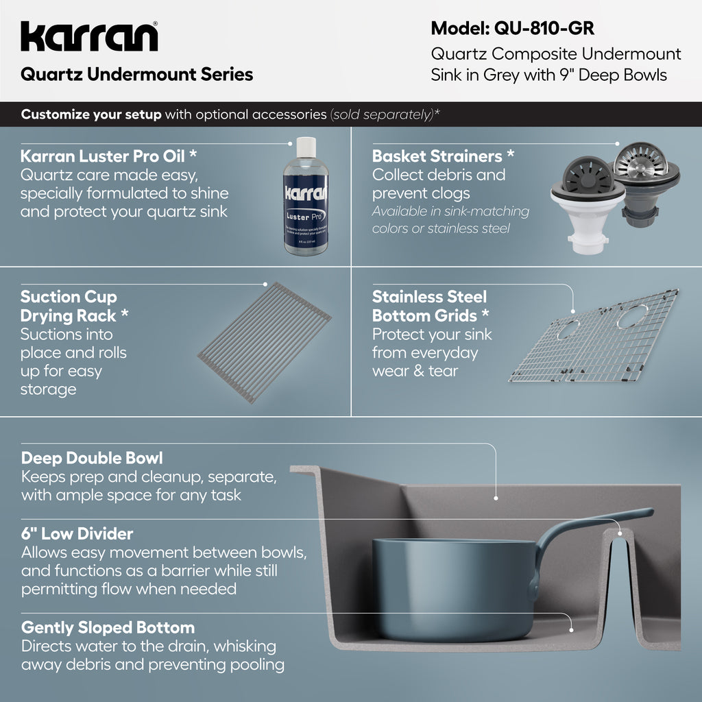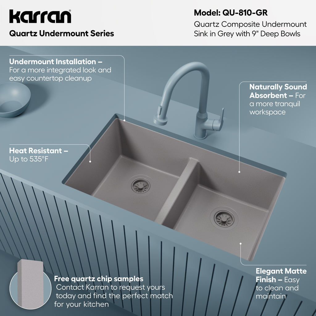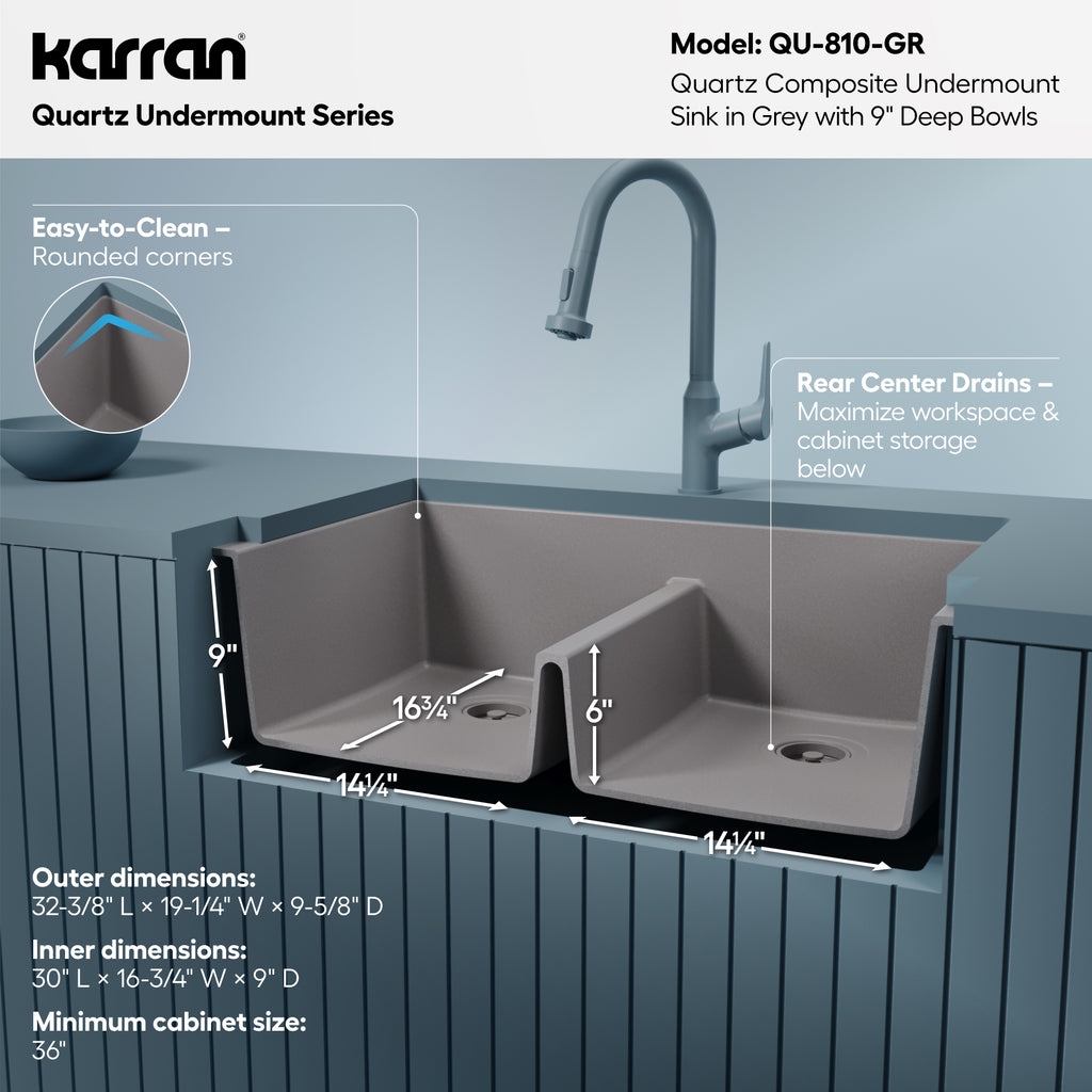 Karran 32" Undermount Quartz Composite Kitchen Sink, 50/50 Double Bowl, Grey, QU-810-GR