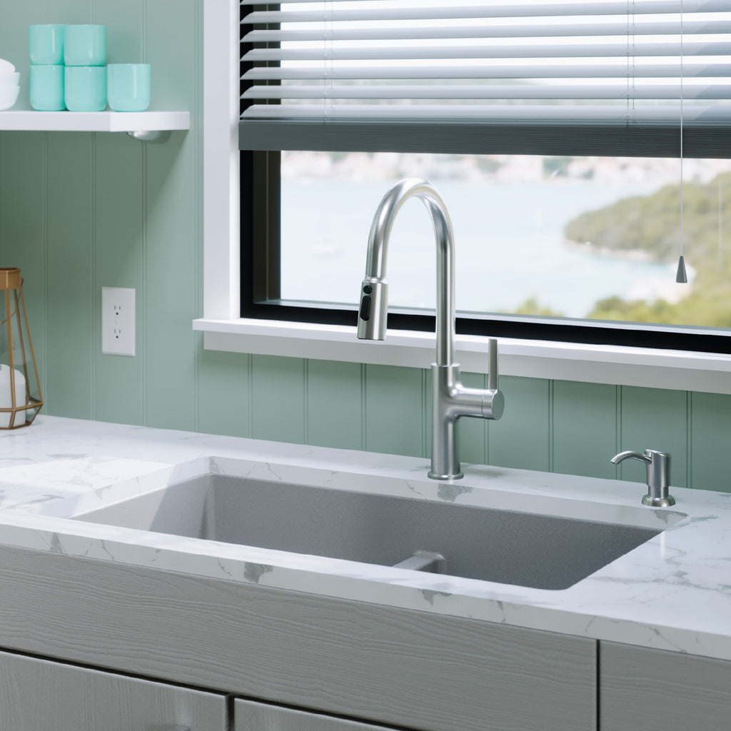 This modern design with crisp, linear styling is sure to be the focal point in your kitchen. Its quartz composite material gives it outstanding durability and will provide years of trouble-free use. This undermount design is available in a selection of 6 elegant color choices to compliment any decor.