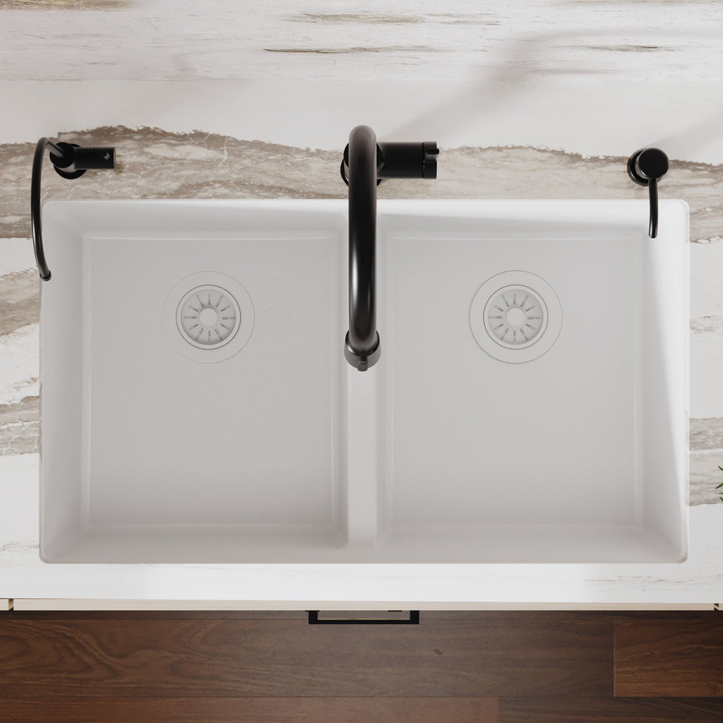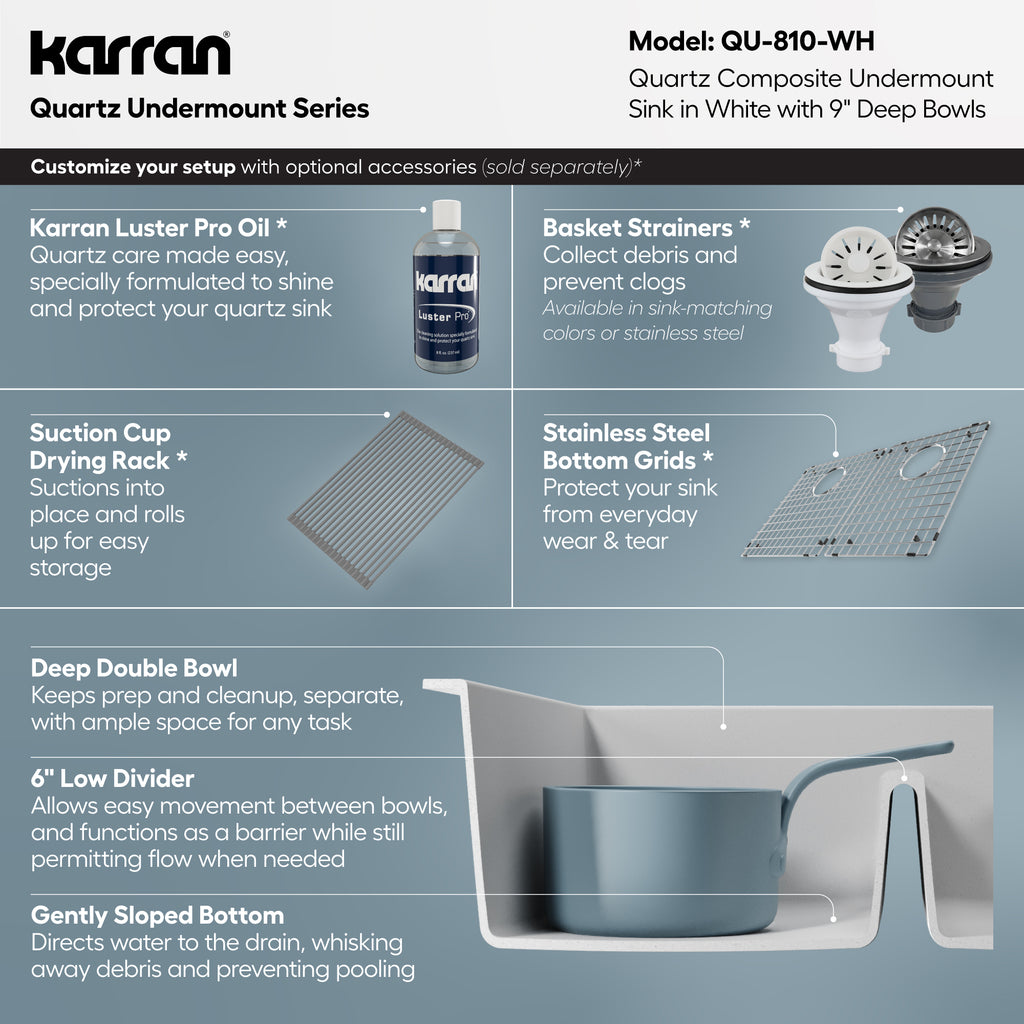 Karran 32" Undermount Quartz Composite Kitchen Sink, 50/50 Double Bowl, White, QU-810-WH