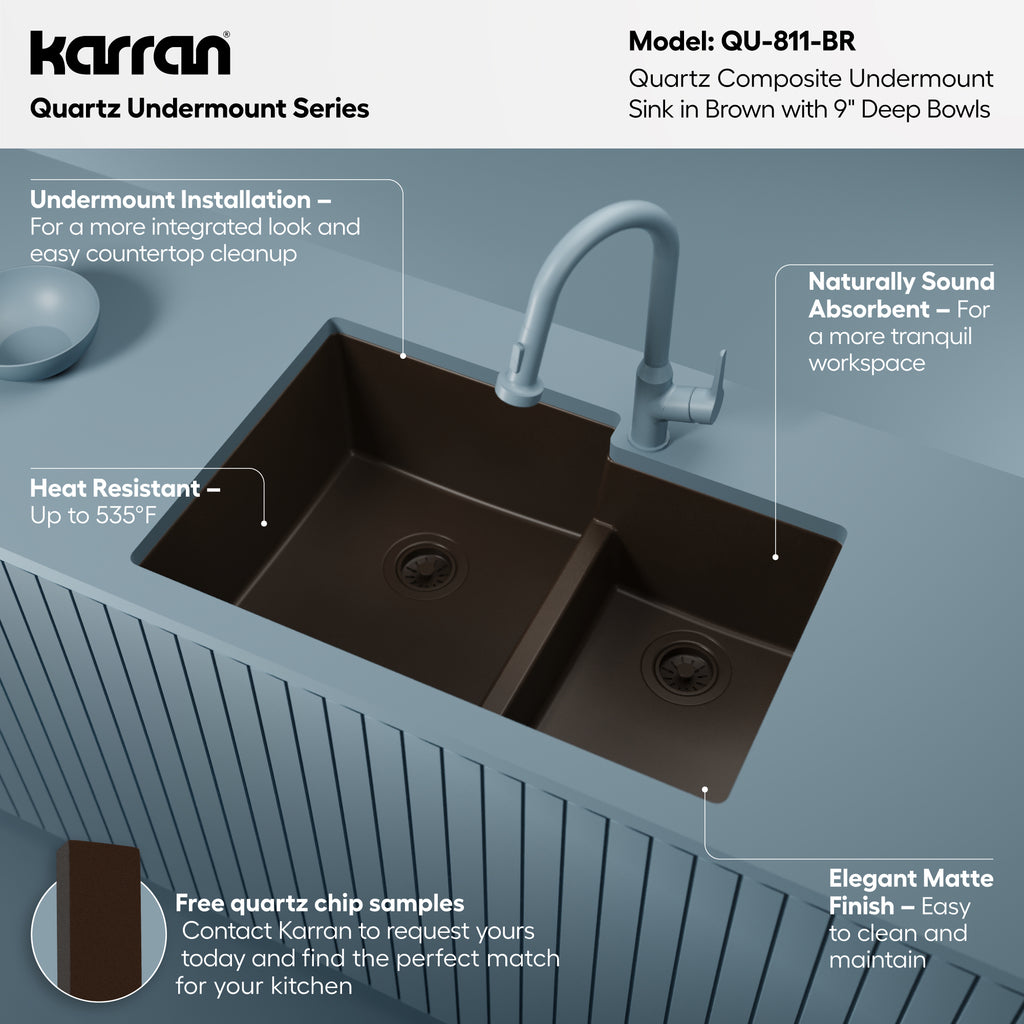 Karran 32" Undermount Quartz Composite Kitchen Sink, 60/40 Double Bowl, Brown, QU-811-BR