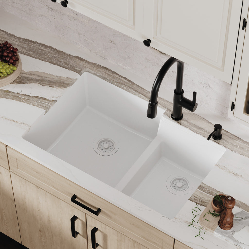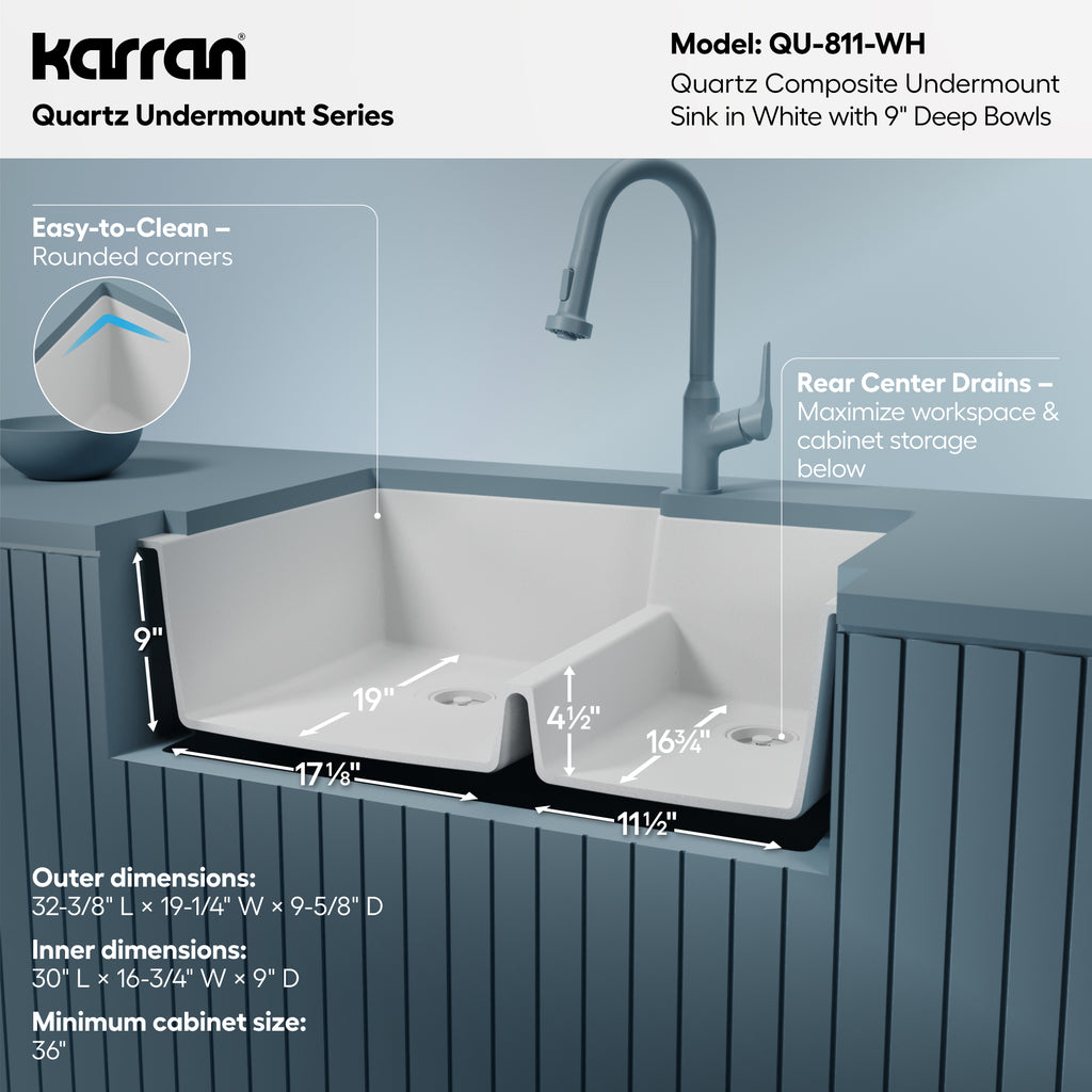 Karran 32" Undermount Quartz Composite Kitchen Sink, 60/40 Double Bowl, White, QU-811-WH