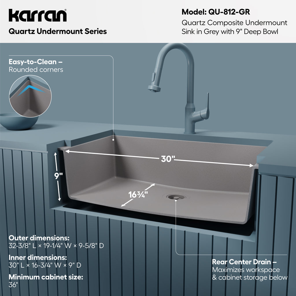 Karran 32" Undermount Quartz Composite Kitchen Sink, Grey, QU-812-GR