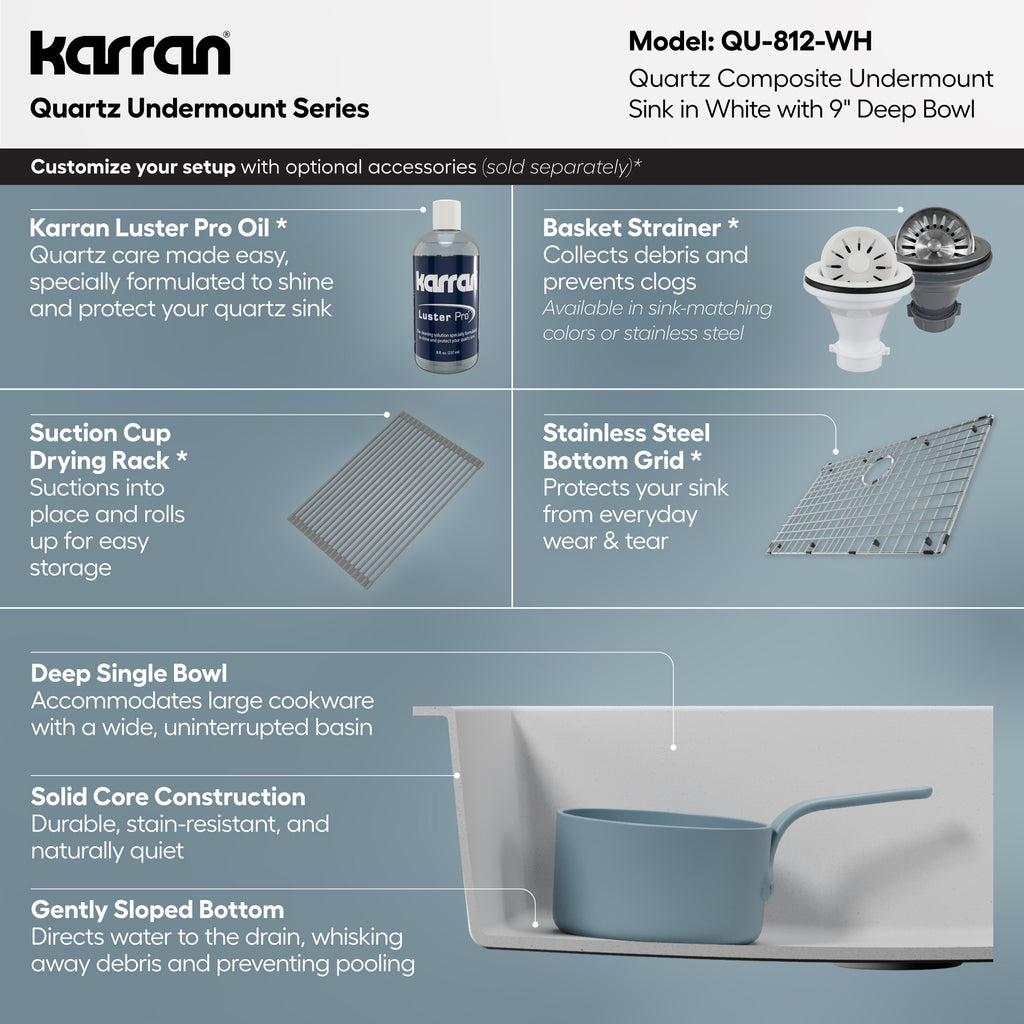 Karran 32" Undermount Quartz Composite Kitchen Sink, White, QU-812-WH