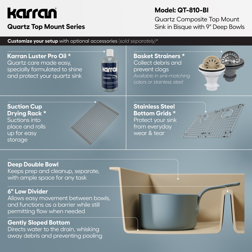 The Karran Top Mount 33" Double Bowl Quartz Composite Kitchen Sink combines professional-grade performance with intelligent workspace design for serious home chefs and busy family kitchens. Engineered with premium 80% natural quartz composite construction, this exceptional top mount kitchen sink delivers superior durability, extreme 535F heat resistance, and authentic granite stone aesthetics that seamlessly complement any kitchen design vision from traditional to contemporary. Two extra-deep 9-inch bowls with practical low-profile center divider create dedicated workspace zones while accommodating oversized cookware, roasting pans, and large serving pieces when needed for maximum kitchen efficiency. Sound-dampening granite composite construction naturally eliminates noise and vibration for peaceful cooking environments, while DIY-friendly drop-in installation includes precision cutting template and complete mounting hardware system. This premium double bowl kitchen sink transforms meal preparation workflows with intelligent design features that serious home chefs demand for decades of reliable performance backed by comprehensive lifetime limited warranty protection, cUPC certification standards, and professional-grade quality assurance for complete peace of mind in demanding kitchen applications.
