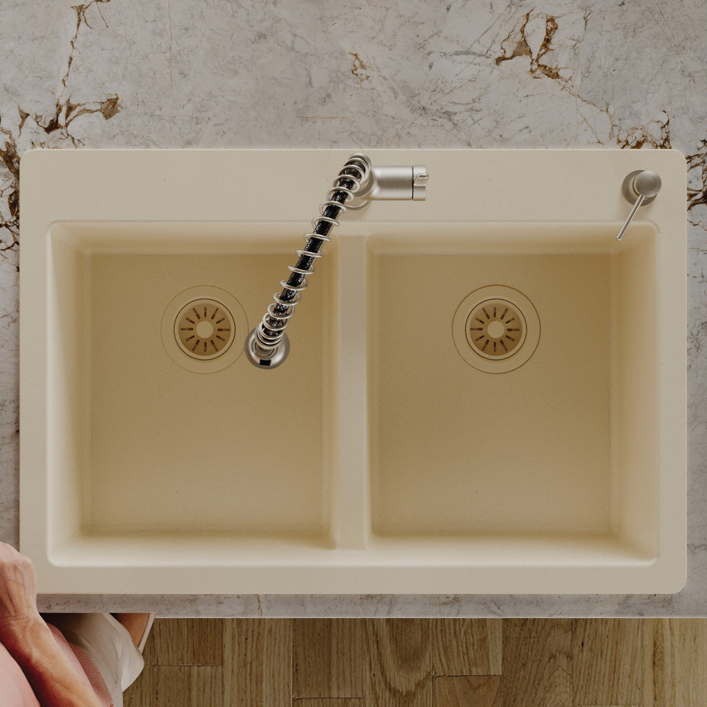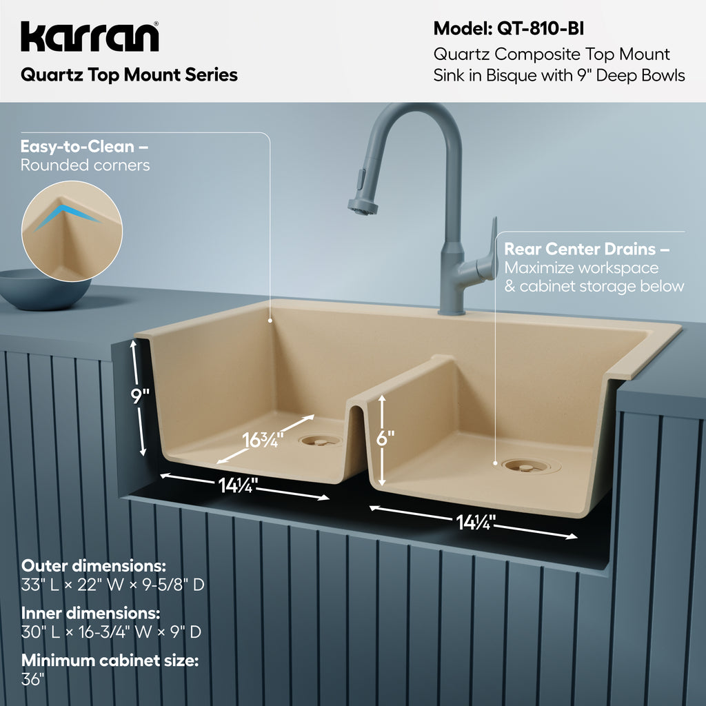 Karran 33" Drop In/Topmount Quartz Composite Kitchen Sink, 50/50 Double Bowl, Bisque, QT-810-BI