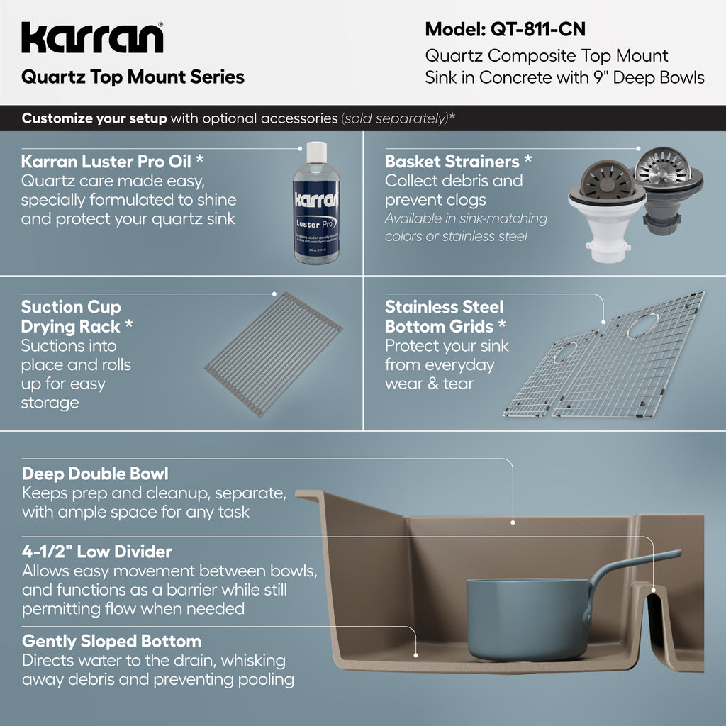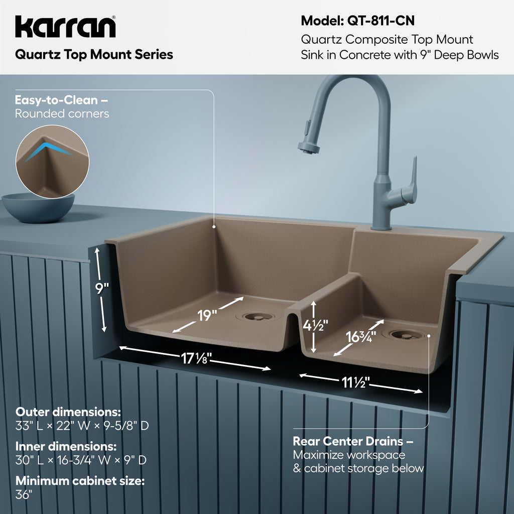 Karran 33" Drop In/Topmount Quartz Composite Kitchen Sink, 60/40 Double Bowl, Concrete, QT-811-CN