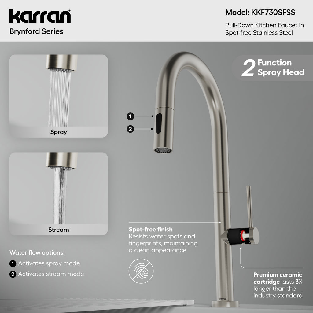 The Karran Brynford Single-Handle Pull-Down Kitchen Faucet delivers refined styling, effortless maintenance, and all-stainless-steel construction. Designed for long-term reliability, every componentfrom the body and handle to the spoutis crafted from solid stainless steel for maximum strength and corrosion resistance. The slim 30 mm profile and high-arc design create a sleek modern look that enhances any kitchen. Precision 2-Function Control lets you switch smoothly between spray and stream modes via soft-touch buttons to tackle everything from rinsing produce to filling pots. The 90 forward-rotating handle prevents backsplash interference, and the 360 swivel spout provides complete sink coverage. A 26-inch nylon braided hose extends professional-grade reach and retracts securely. The commercial-grade ceramic cartridge is rated for 1.5 million cycles, and a 1.8 GPM aerator delivers smooth, splash-free flow. Finished in premium spot-free PVD coating, this faucet resists fingerprints, water spots, and tarnishing, keeping your kitchen beautiful with minimal maintenance.