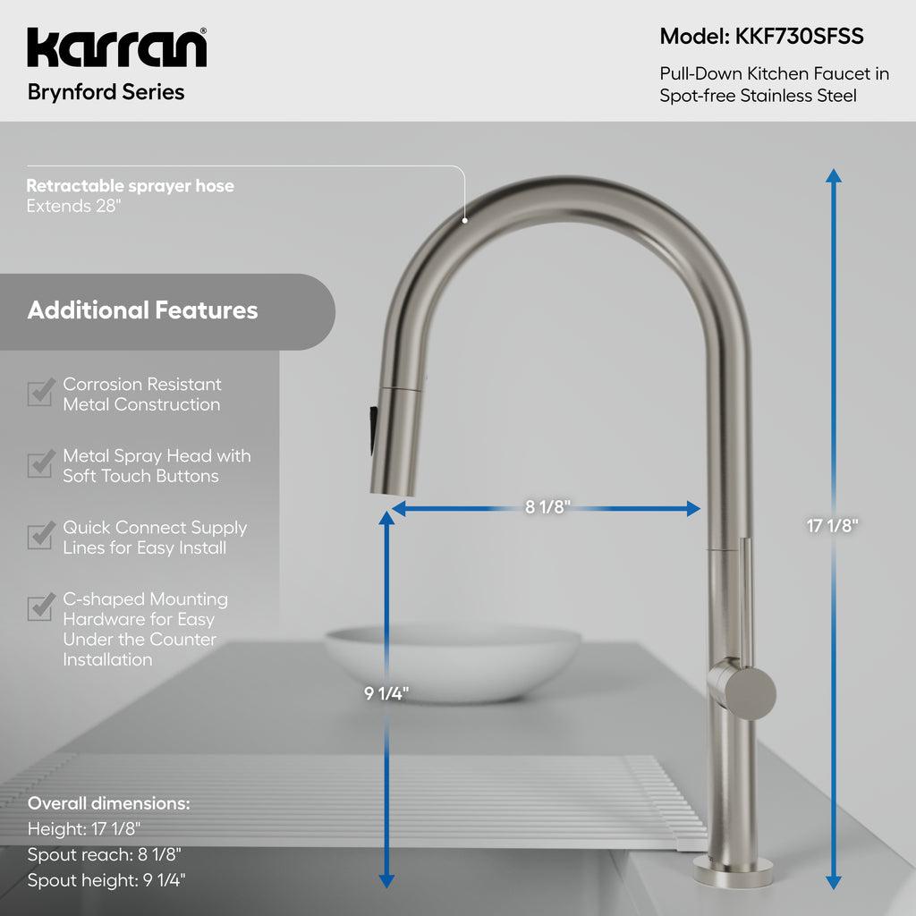 Karran Brynford 1.8 GPM Single Lever Lead-free Brass ADA Kitchen Faucet, Pull-Down, Spot Free Stainless Steel, KKF730SFSS