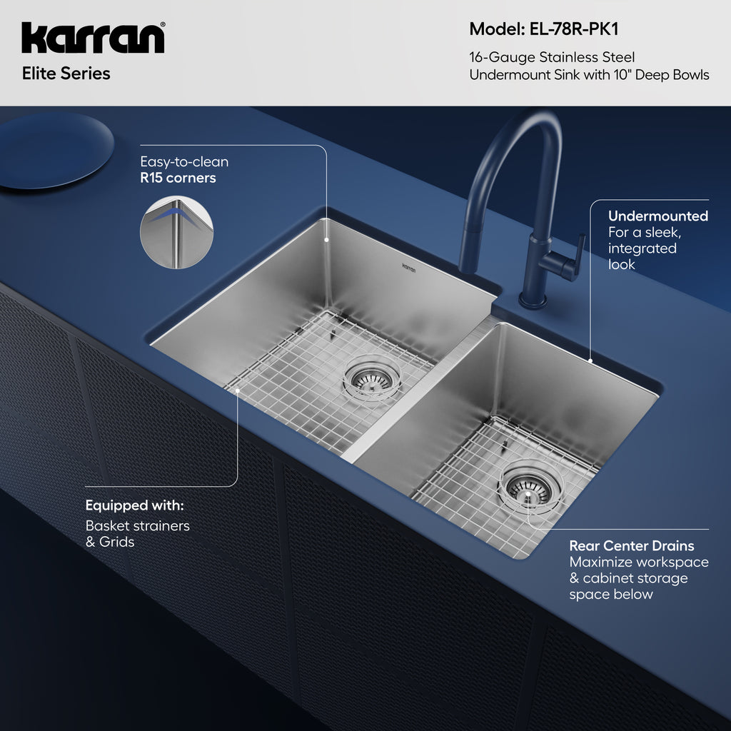 Karran Elite 33" Undermount Stainless Steel Kitchen Sink with Accessories, 60/40 Double Bowl, 16 Gauge, EL-78R-PK1