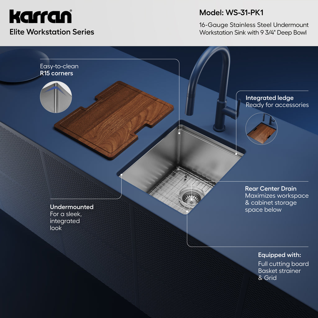 Enhance your kitchen's efficiency with the undermount WS-31-PK1 Workstation Sink from Karran's Elite collection, handcrafted to elevate your culinary workspace with its innovative smart ledge system. Inspired by professional kitchens, this compact 15" workstation sink empowers your bar, prep, or entertainment area with unparalleled functionality. Whether as a primary sink in a smaller kitchen or a versatile addition to larger spaces, its smart ledge system supports the Cutting Board and Drying Rack, maximizing utility without sacrificing counter space. Handmade from robust 16-gauge T304 stainless steel, this sink combines durability with a sleek satin finish, ensuring long-lasting performance and a modern aesthetic upgrade to any home kitchen.
