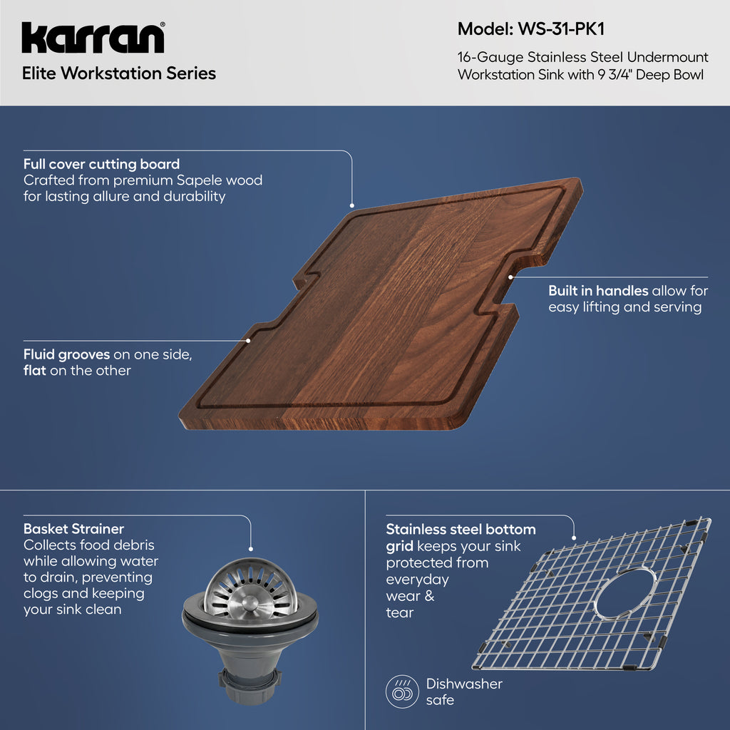 Karran Elite Workstation 15" Undermount Stainless Steel Workstation Kitchen Sink with Accessories, 16 Gauge, WS-31-PK1