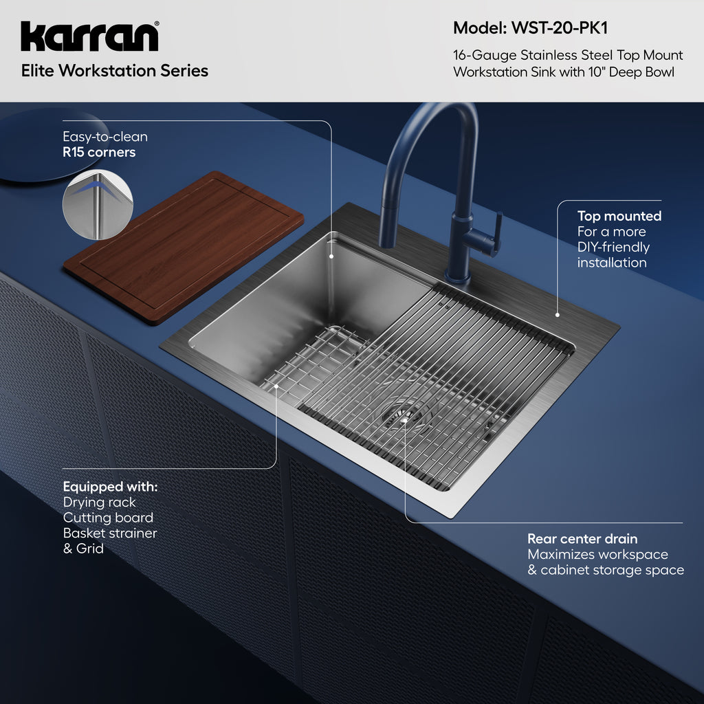 Karran Elite Workstation 25" Drop In/Topmount Stainless Steel Workstation Kitchen Sink with Accessories, 16 Gauge, WST-20-PK1