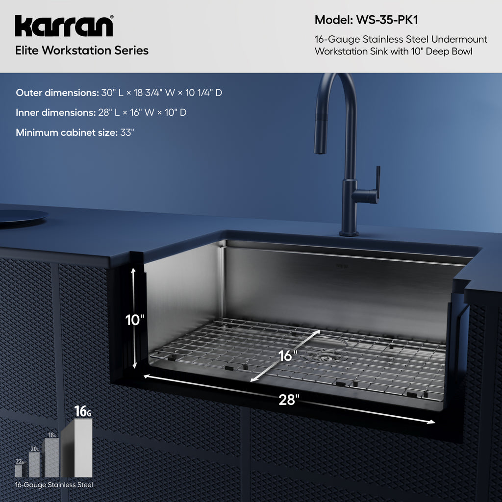 Enhance your kitchen's efficiency with the undermount WS-35-PK1 Workstation Sink from Karran's Elite collection, meticulously handcrafted to elevate your culinary workspace with its spacious dimensions and innovative smart ledge system. Inspired by professional kitchens, this 30" workstation sink offers ample room for multitasking and handling large cookware, ideal for primary or secondary sinks in modern kitchens. Handmade from robust 16-gauge T304 stainless steel with a sleek satin finish, this sink ensures exceptional durability and a stylish aesthetic upgrade.
