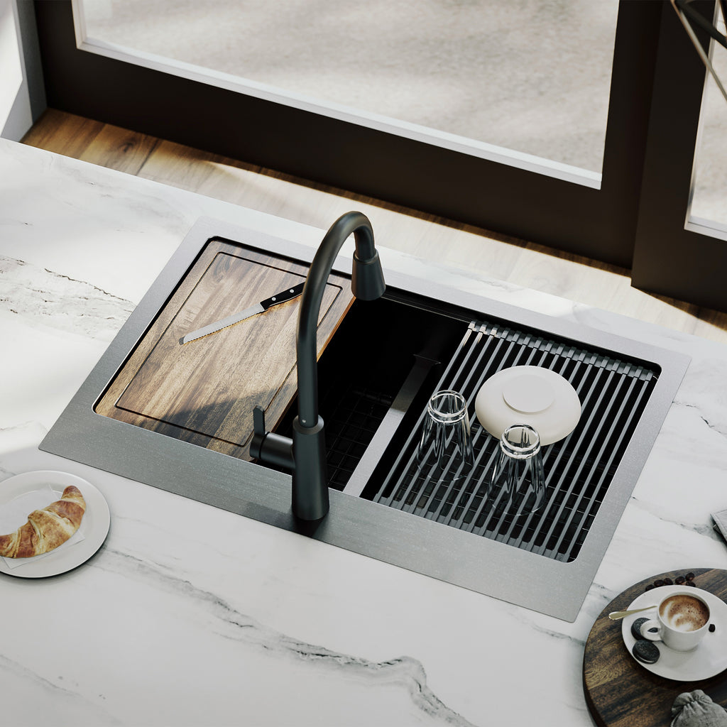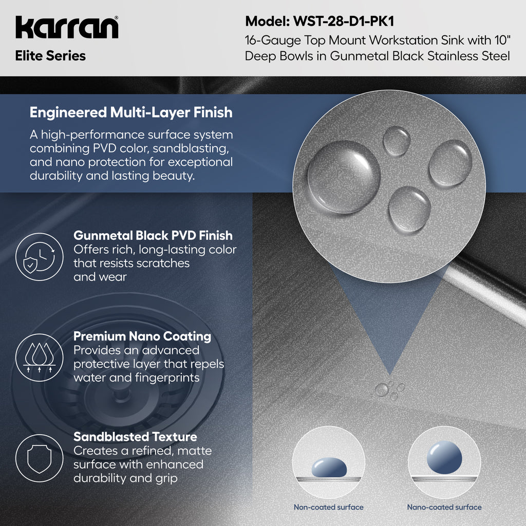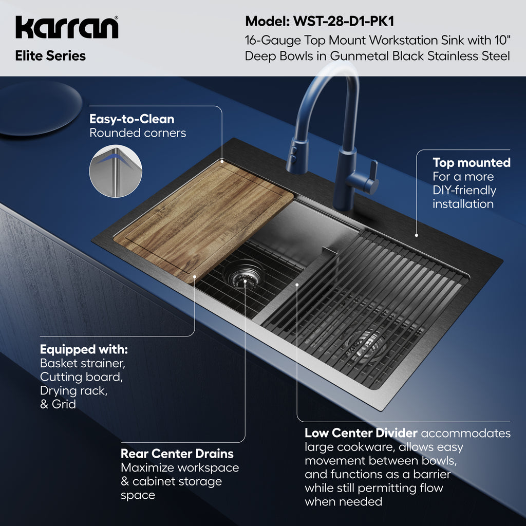 The Karran Elite 33" Top Mount Workstation 16 Gauge Stainless Steel Double Bowl Kitchen Sink In Gunmetal Black delivers professional-grade dual-zone workstation functionality in a bold, advanced gunmetal black finish. Constructed from commercial-grade 16-gauge T304 stainless steel, this superior drop-in sink features a multi-layer PVD coating with advanced nano protection that resists scratches, fingerprints, and water spots. A sandblasted matte texture enhances durability and grip for a finish that performs as well as it looks. Dual extra-deep 10" bowls, each measuring 14-1/2" x 16", provide independent workstation zones for washing large cookware in one bowl while prepping in the other. The low center divider accommodates oversized cookware and allows easy movement between both bowls while maintaining the full versatility of a dual bowl configuration. Rear-center drains in both bowls maximize usable workspace and cabinet storage below. Top mount installation is DIY-friendly and accessible for most skill levels. Fits a minimum 36" base cabinet with one pre-drilled faucet hole. The 3-1/2" drain openings are compatible with most garbage disposals. Includes a complete workstation package: a custom Acacia wood cutting board, two matching gunmetal black PVD bottom grids, a heat-safe drying rack rated to 400F, and two basket strainers. Grids, rack, and strainers are all dishwasher-safe. cUPC certified, limited lifetime warranty.