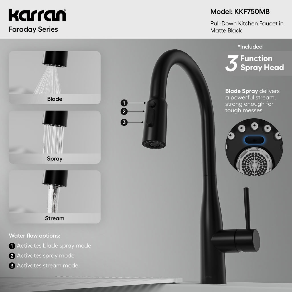 Karran Faraday 1.8 GPM Single Lever Lead-free Brass ADA Kitchen Faucet, Pull-Down, Matte Black, KKF750MB