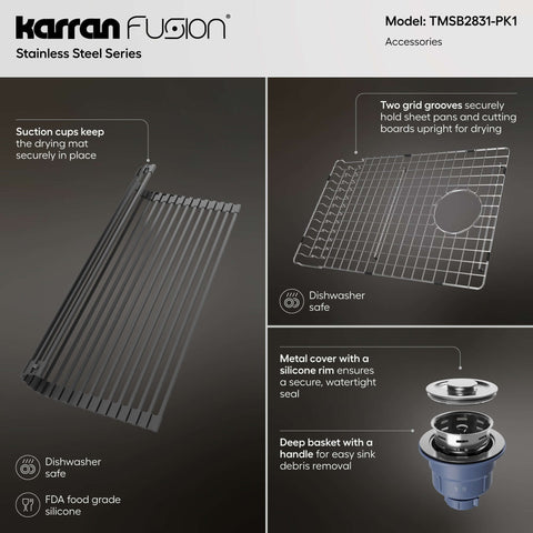 Karran Fusion 28" Drop In/Topmount Stainless Steel Kitchen Sink with Accessories, 16 Gauge, TMSB2831-PK1