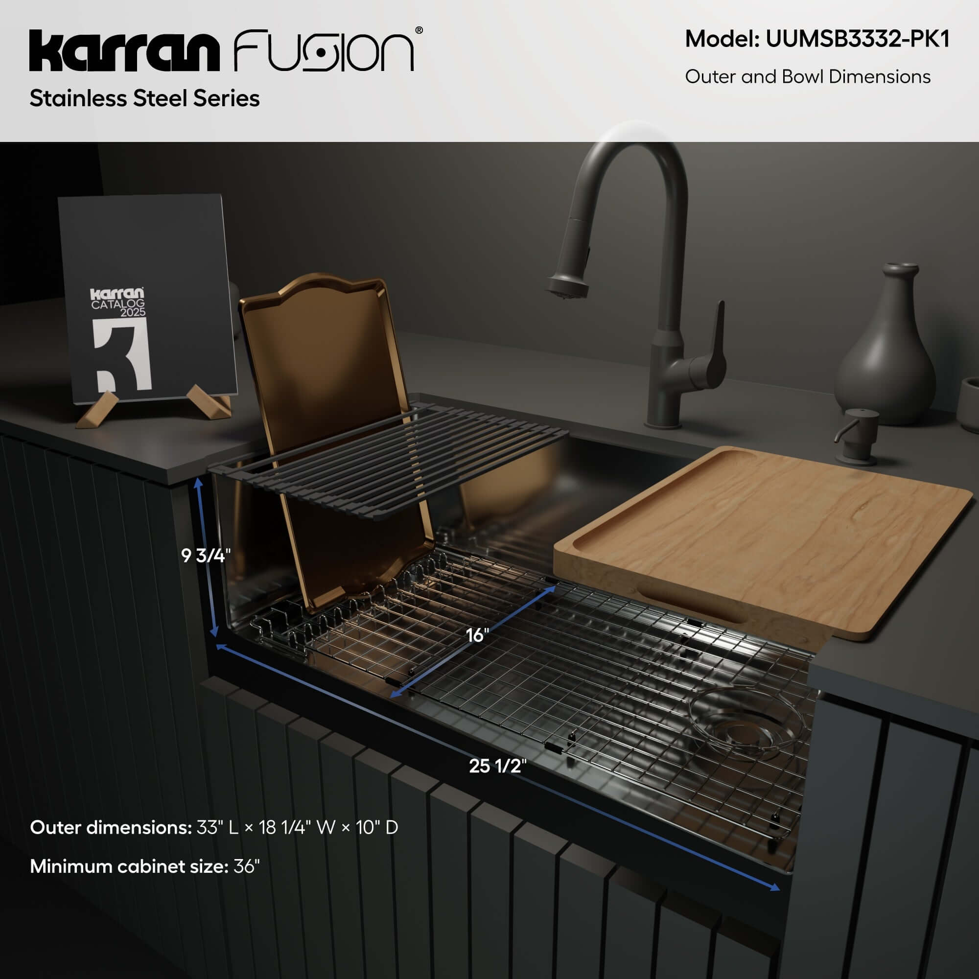 Karran Fusion 33" Undermount Stainless Steel Workstation Kitchen Sink with Accessories, 16 Gauge, UUMSB3332-PK1