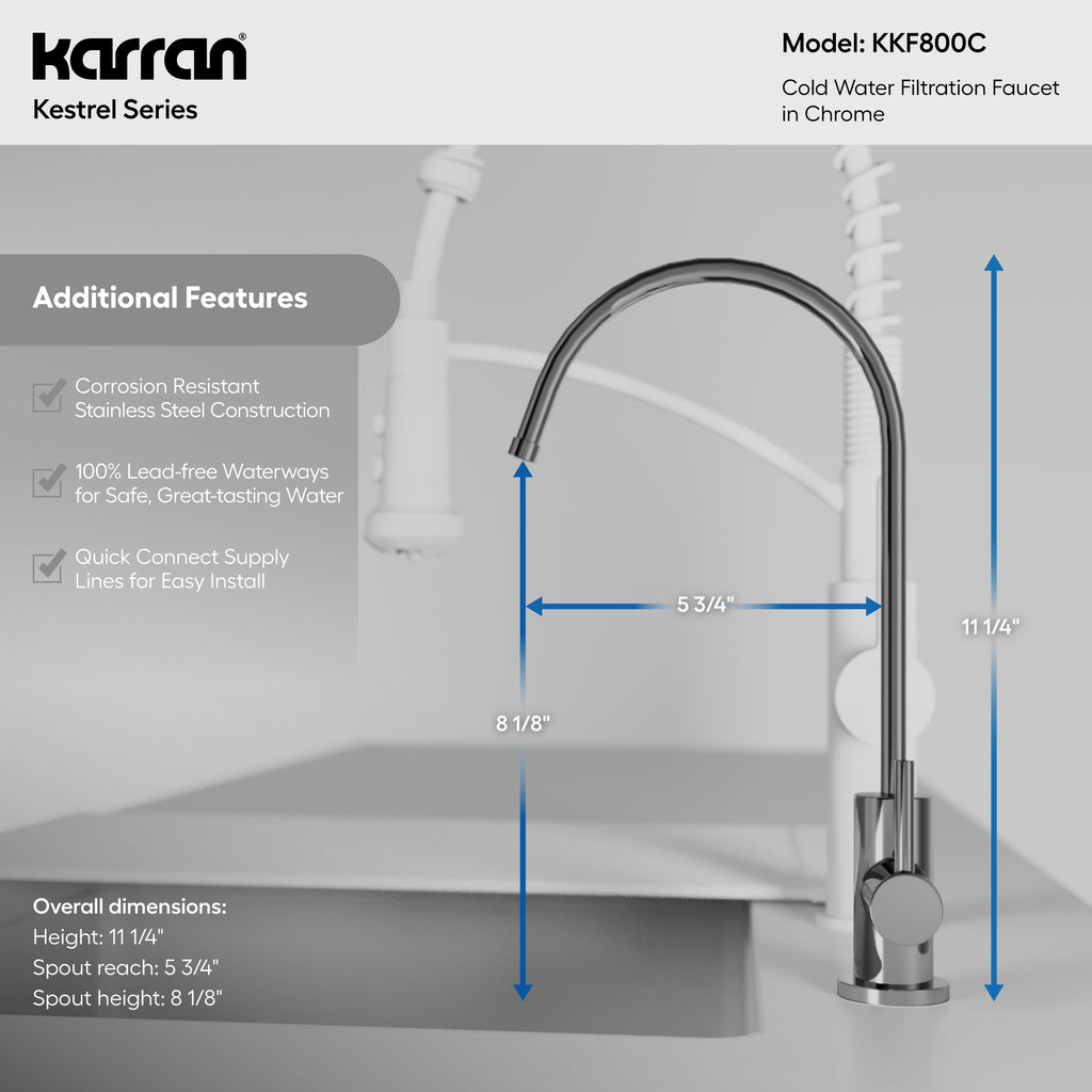 The Karran Kestrel Single-Handle Beverage Faucet delivers pure, great-tasting filtered water with precision engineering and 100% lead-free waterways. Designed exclusively for cold-water use, this premium all-stainless-steel faucet connects directly to under-counter reverse osmosis and ultra-filtration systems for clean, refreshing water on demand. The compact, space-saving design measures 11 inches in height and 5 inches in reach, making it the ideal secondary faucet for kitchens, bars, or prep areas. The 90 forward-rotating stainless-steel handle prevents backsplash interference, while the 360 swivel spout offers perfect positioning for glasses and bottles. Constructed entirely from stainless steelincluding the body, handle, and spoutthe Kestrel ensures long-term strength and corrosion resistance. A 1.5 million-cycle ceramic cartridge (1.5x industry standard) provides drip-free reliability, while the optimized 1.0 GPM flow rate delivers a perfectly aerated stream for drinking and beverage preparation. Single-hole installation with quick-connect lines ensures simple, secure integration with your filtration system.
