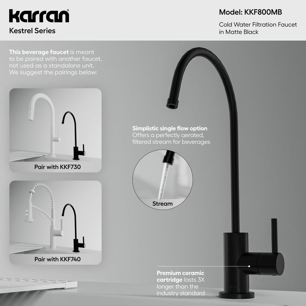 The Karran Kestrel Single-Handle Beverage Faucet delivers pure, great-tasting filtered water with precision engineering and 100% lead-free waterways. Designed exclusively for cold-water use, this premium all-stainless-steel faucet connects directly to under-counter reverse osmosis and ultra-filtration systems for clean, refreshing water on demand. The compact, space-saving design measures 11 inches in height and 5 inches in reach, making it the ideal secondary faucet for kitchens, bars, or prep areas. The 90 forward-rotating stainless-steel handle prevents backsplash interference, while the 360 swivel spout offers perfect positioning for glasses and bottles. Constructed entirely from stainless steelincluding the body, handle, and spoutthe Kestrel ensures long-term strength and corrosion resistance. A 1.5 million-cycle ceramic cartridge (1.5x industry standard) provides drip-free reliability, while the optimized 1.0 GPM flow rate delivers a perfectly aerated stream for drinking and beverage preparation. Single-hole installation with quick-connect lines ensures simple, secure integration with your filtration system.