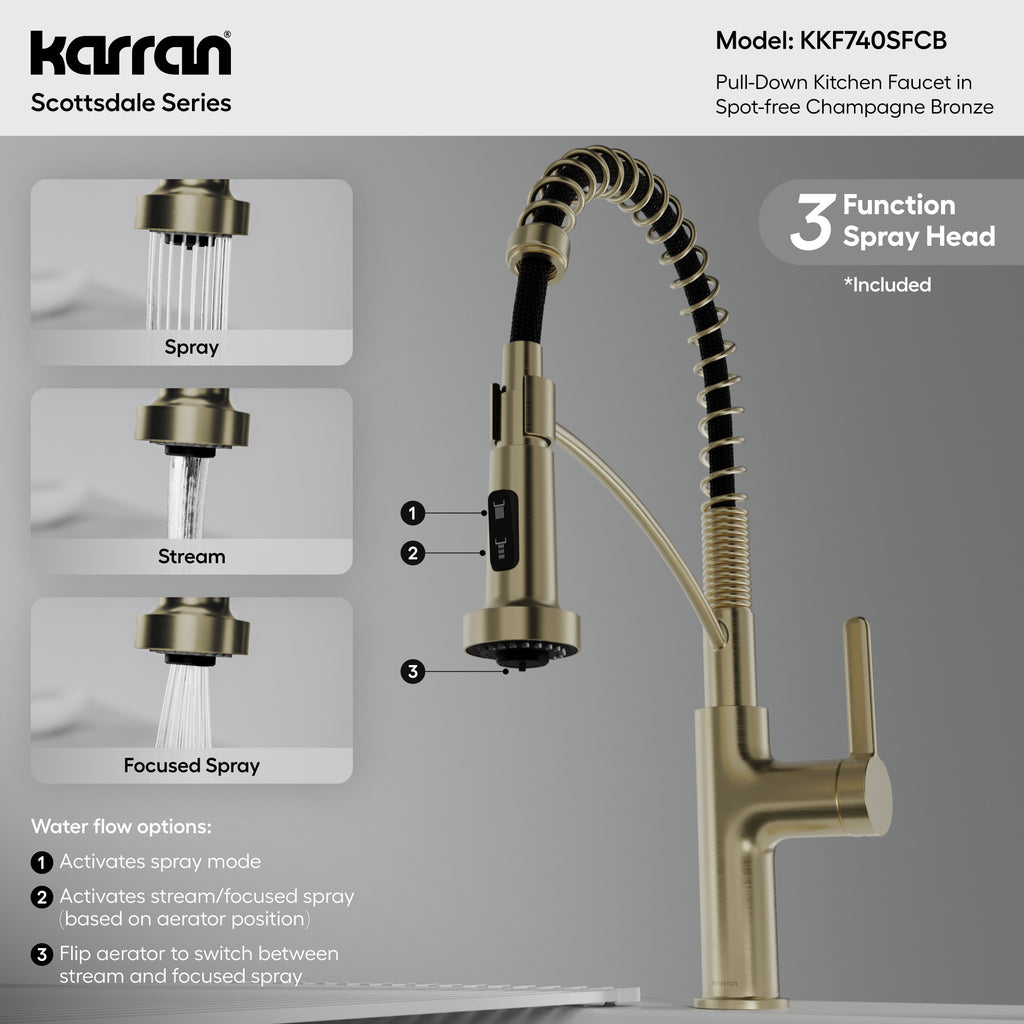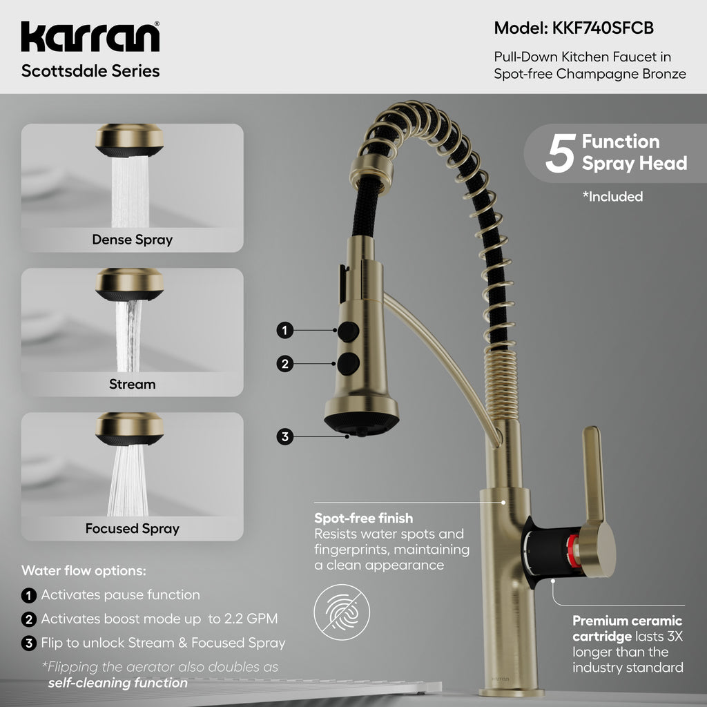 The Karran KKF740 Scottsdale Single-Handle Pull-Down Kitchen Faucet brings professional versatility and easy maintenance to any kitchen. Equipped with two interchangeable sprayheads, it features the 3-function Revolve Mini sprayer for everyday use and the 5-function Revolve MAX sprayer for heavy-duty cleaning. The Revolve MAX offers stream, spray, focused spray, pause, and boost functions up to 2.2 GPM, while both incorporate advanced Revolve aerator technology for clog-resistant precision flow. The stainless-steel commercial-style spring and 360 high-arc spout ensure full reach and exceptional clearance. A 90 forward-rotating handle prevents backsplash interference, and the 26-inch nylon braided hose provides professional-grade flexibility with smooth retraction. Constructed from stainless steel with lead-free waterways, this faucet includes a commercial-grade ceramic cartridge rated for 1.5 million cycles. The premium spot-free PVD finish resists fingerprints, water spots, and tarnishing, keeping your faucet spotless and brilliant with minimal cleaning.