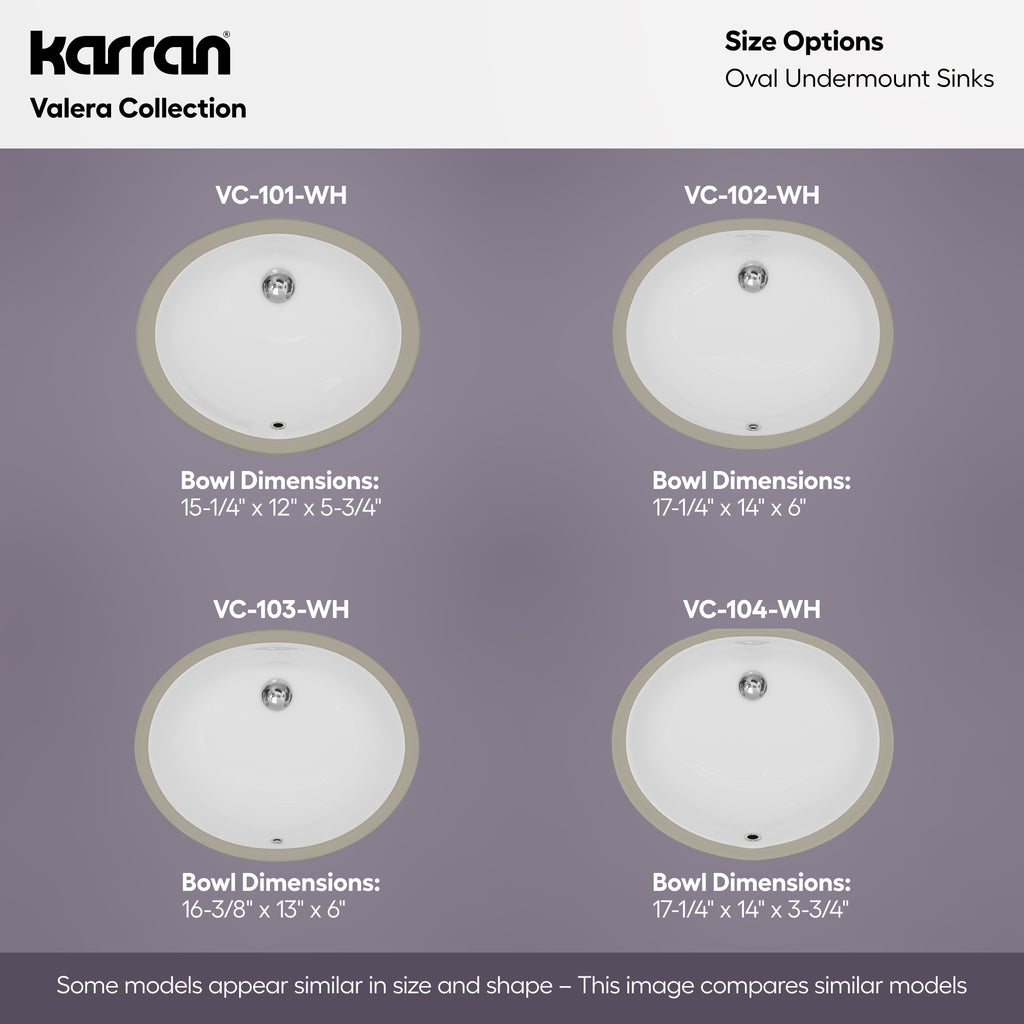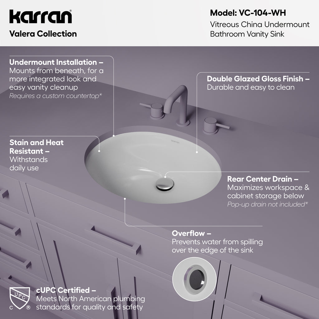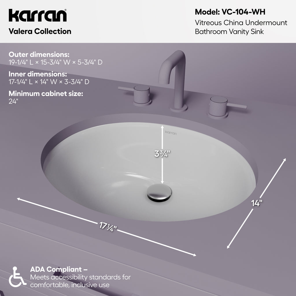 Karran Valera 15.75" x 19.25" Oval Undermount Vitreous China ADA Bathroom Sink, White, VC-104-WH