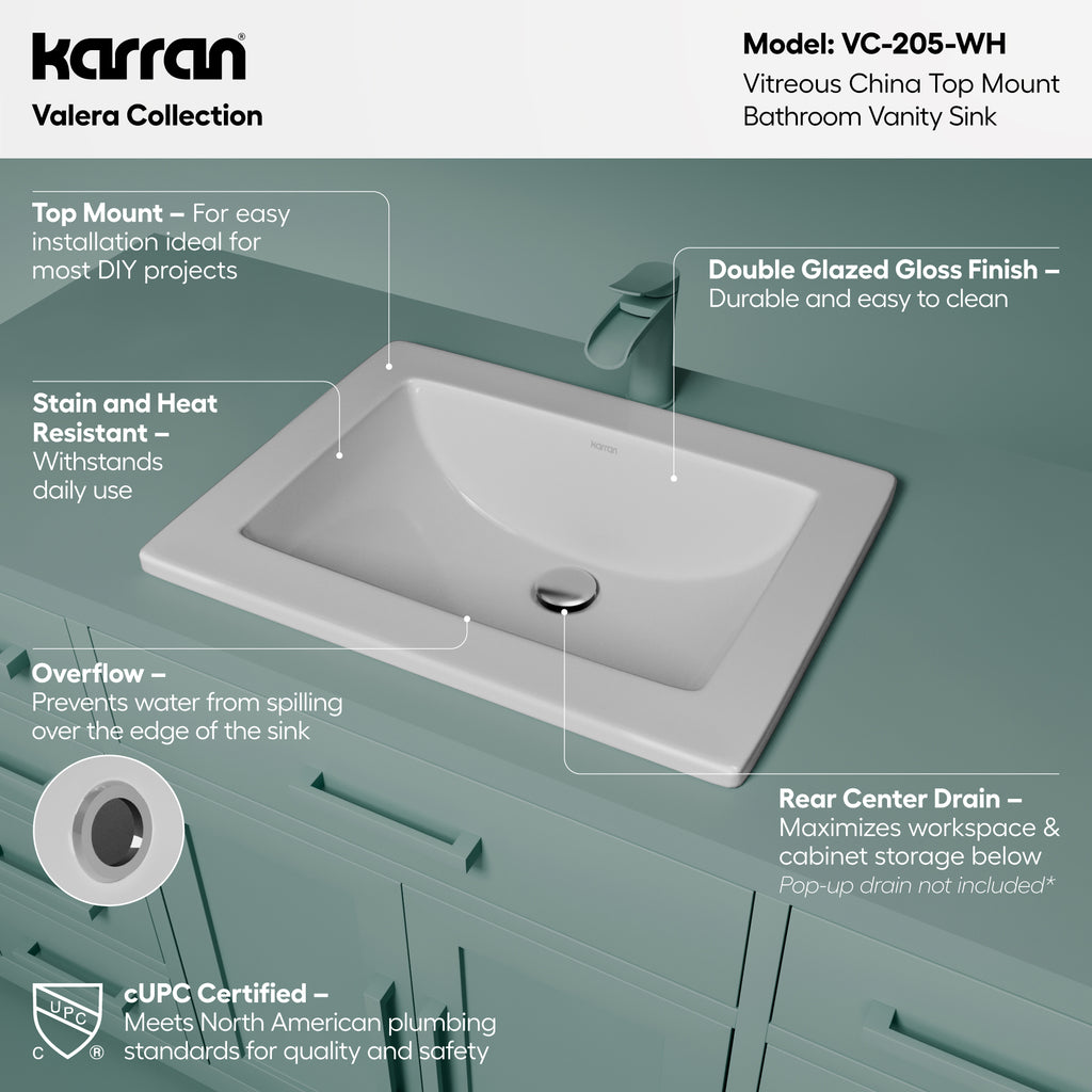Karran Valera 17.125" x 23.25" Rectangular Drop In/Topmount Vitreous China ADA Bathroom Sink, White, VC-205-WH