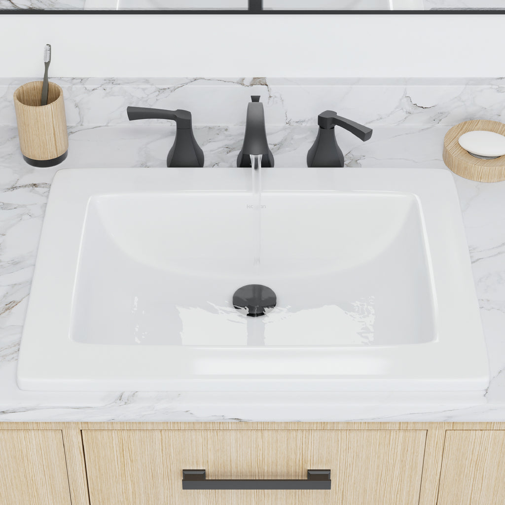 Experience superior craftsmanship with the Karran Valera 23" Rectangular Top Mount Vitreous China Bathroom Sink in White, engineered for maximum functionality and enhanced performance in luxury bathroom installations. This advanced extra-large rectangular top mount sink features double-glazed porcelain construction that delivers exceptional stain resistance, superior heat protection, and comprehensive mineral buildup prevention for complete maintenance convenience and long-term reliability. The strategic rear-center drain design maximizes available cabinet storage space while ensuring optimal plumbing clearance in standard 27" vanity installations and custom configurations. Convenient top mount installation provides hassle-free setup that's ideal for DIY enthusiasts and professional contractors, offering compatibility with most countertop materials and simplified installation procedures. Built-in overflow protection prevents spillage during peak usage periods and busy household schedules, while the naturally quiet vitreous china construction minimizes water noise and splashing for superior bathroom comfort. The extra-large rectangular design offers spacious geometric lines for luxury bathroom aesthetics, while the 17-7/8" x 11-7/8" x 6-1/8" interior bowl dimensions accommodate comfortable daily use with exceptional functionality. ADA compliant design ensures universal accessibility for all users.
