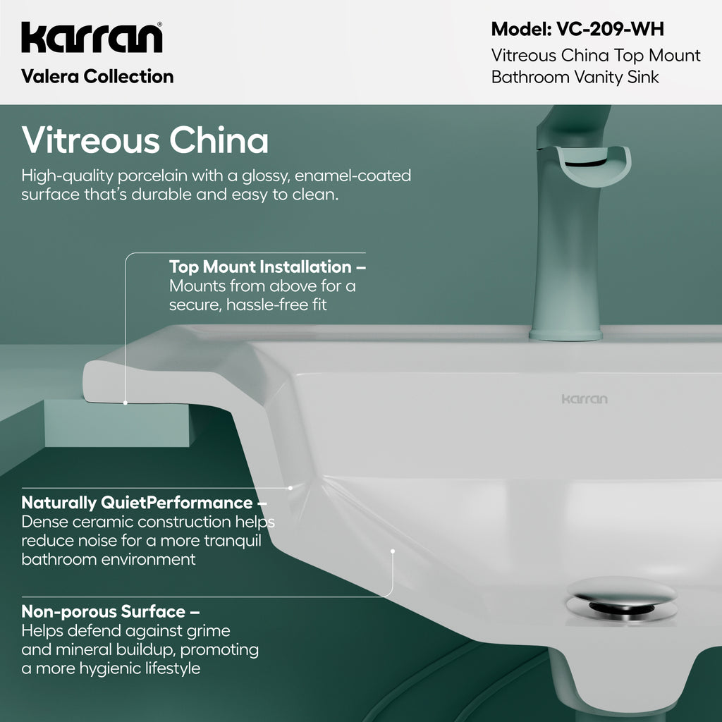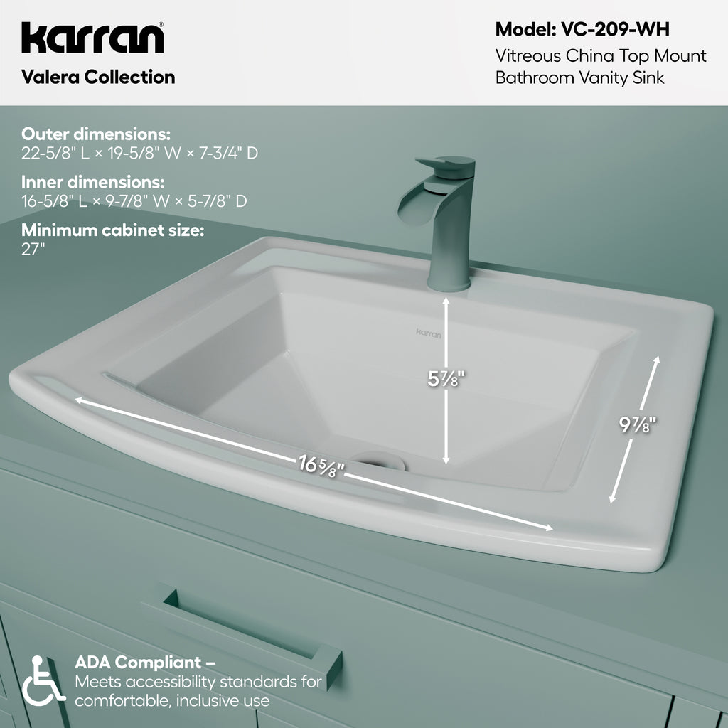 Karran Valera 19.625" x 22.625" Rectangular Drop In/Topmount Vitreous China ADA Bathroom Sink, White, VC-209-WH