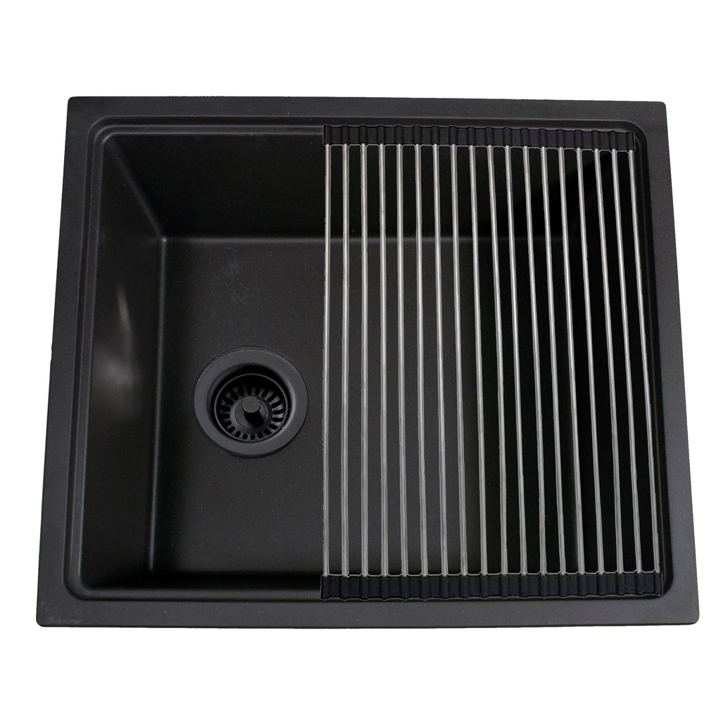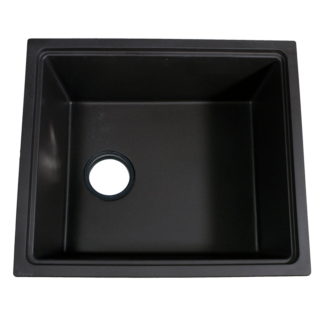 Nantucket Sinks 22 Inch Dualmount workstation sink is the ultimate in functional design. Made in Europe, it comes complete with accessories including a wood cutting board, stainless steel roll up mat and coordinating basket strainer drain. The dualmount design lets you topmount or undermount. Ideal for smaller kitchens, it features a side set drain that can be installed with the drain on the right or left hand side. This helps to provide more unobstructed space under the sink in the cabinet. Made from naturally sound-absorbing granite, this sink is 80% natural stone which helps it to be both resistant to stains and scratches. Because of its material composition, it can withstand thermal shocks and temperatures up to 560 degrees Fahrenheit. The sink is made with a beautiful matte finsh with metallic flecking throughout. Basin is sloped for superior water drainage.
