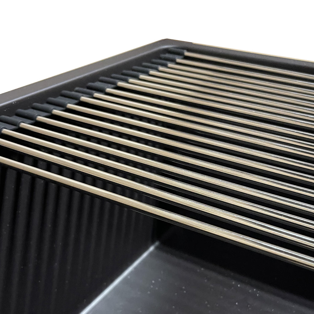 - Specially integrated cutting board, colander, rinse tray and roll up mat fit into ledge above sink