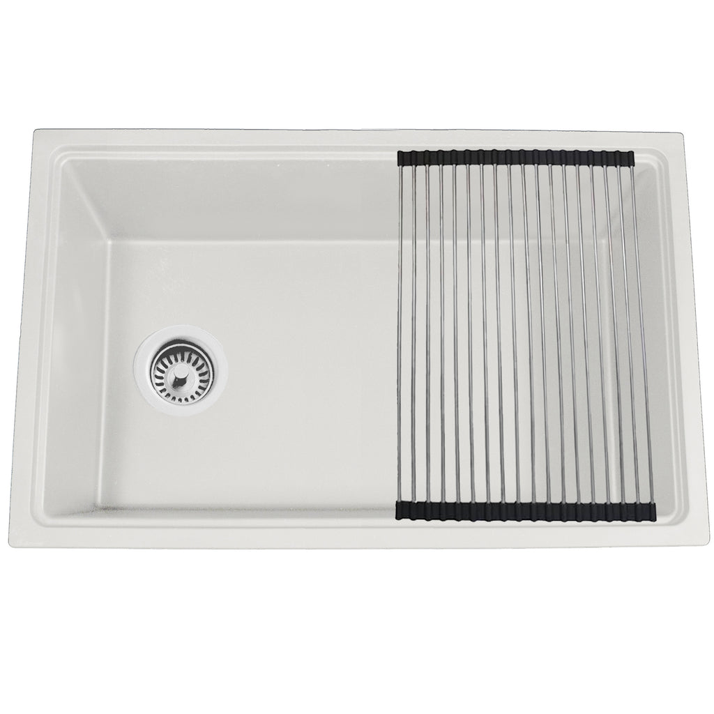 Nantucket Sinks 30 Inch Dualmount workstation sink is the ultimate in functional design. Complete with accessories including a wood cutting board, stainless colander, rinse tray, roll up mat and coordinating basket strainer drain. The dualmount design lets you topmount or undermount. Featuring a side set drain, it can be installed with the drain on the right or left hand side. This helps to provide more unobstructed space under the sink in the cabinet. Made from naturally sound-absorbing granite, this sink is 80% natural stone which helps it to be both resistant to stains and scratches. Because of its material composition, it can withstand thermal shocks and temperatures up to 560 degrees Fahrenheit. The sink is made with a beautiful matte finsh. Basin is sloped for superior water drainage.