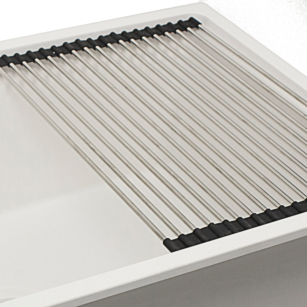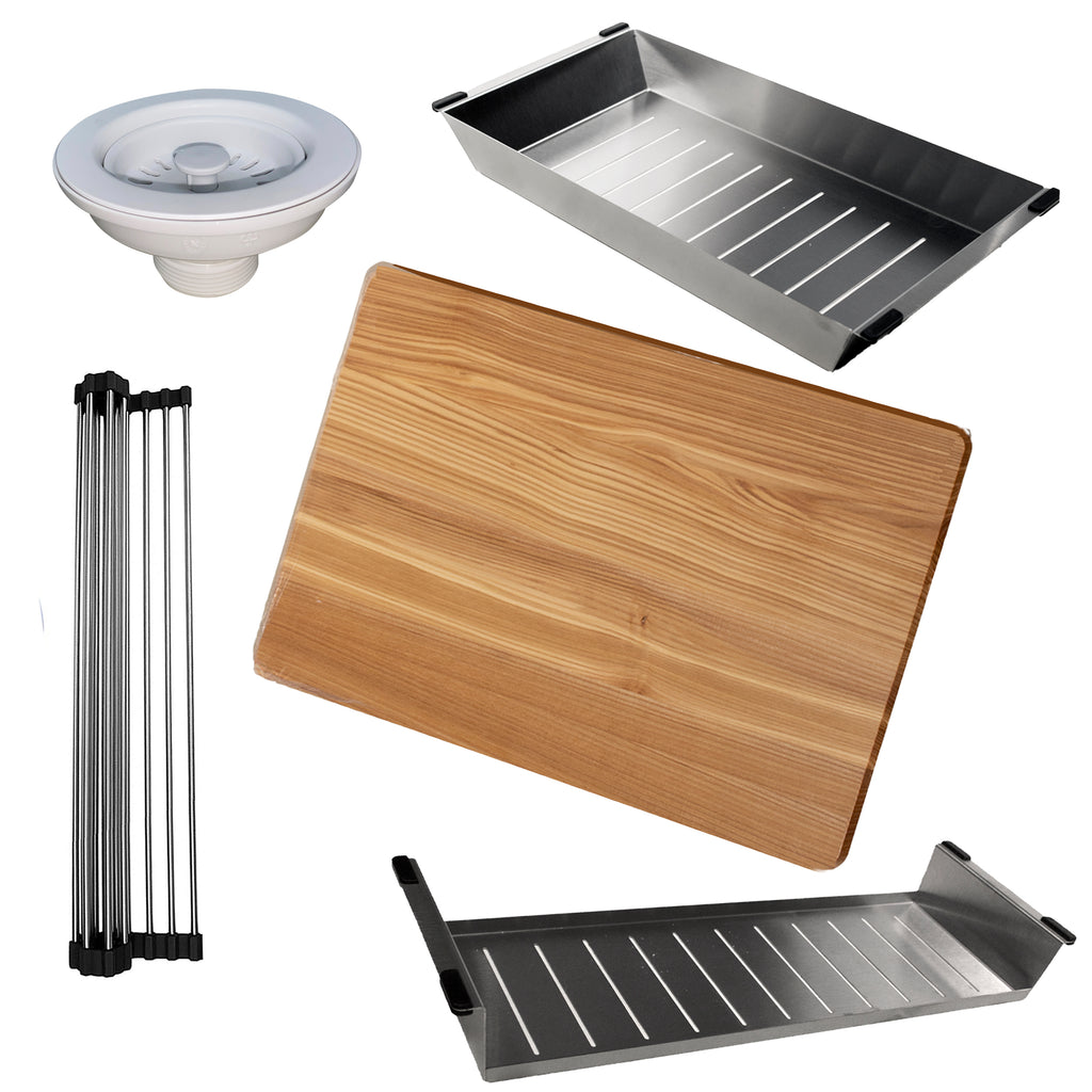 - Specially integrated cutting board, colander, rinse tray and roll up mat fit into ledge above sink
