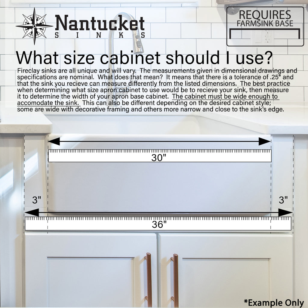 For Farmhouse Sinks the recommended base cabinet size is 3" more than the width of the sink.