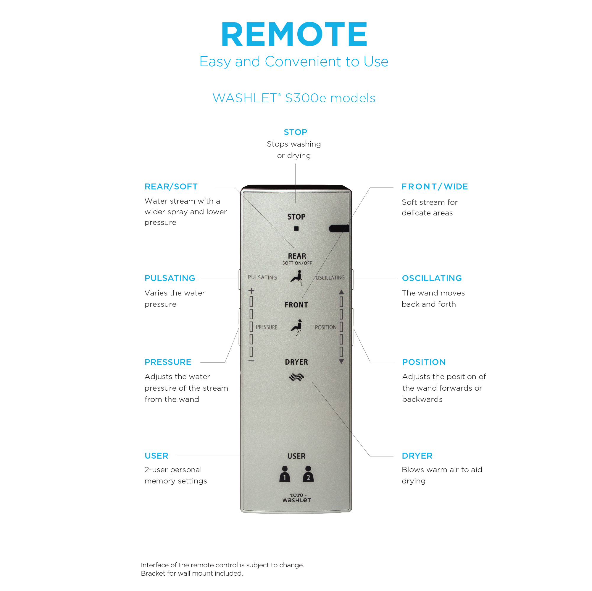 - EMBRACE YOUR UNIQUENESS - The convenient remote allows users to control and set personalized water cleansing settings. Provides luxury and cleanliness at your fingertips; 2 user memory settings for quick access